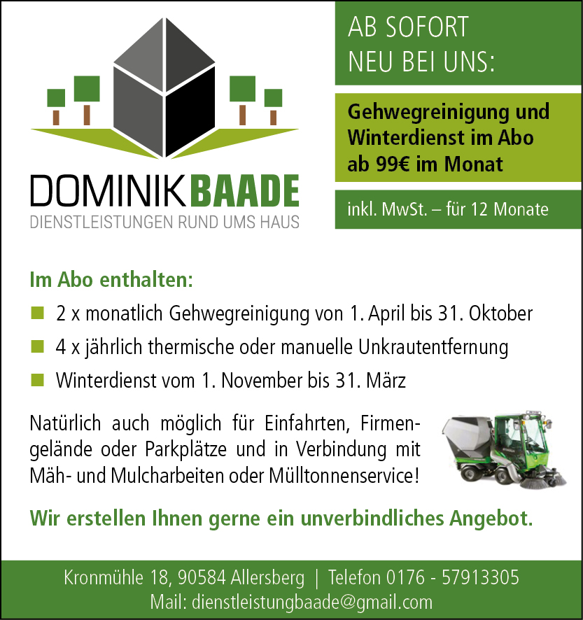 Absolute Weiterempfehlung! Wir haben Dominik und Denise Baade mit der Umgestaltung unseres Garten beauftragt. Außerdem übernehmen die beiden den Winterdienst für unser Geschäft. Die Kommunikation mit beiden ist unkompliziert, offen, nah und fair. Die beiden haben sich viele Gedanken um unsere Wünsche gemacht und die Arbeiten erfolgten zügig, ordentlich und wie gewünscht. Wir sagen Danke!