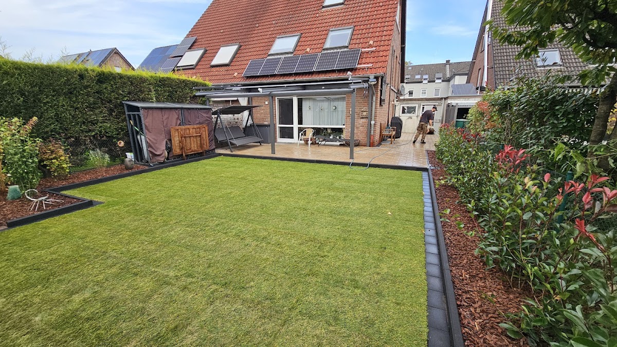 Auf diesem Wege wollen wir uns bei Herrn Giesen, von Grün + Stein, recht herzlich bedanken. Ohne seine kreativen Vorschläge beim Design und der Materialauswahl wäre bestimmt nicht so ein tolles Ergebnis herausgekommen. So wurde ein barrierefreier Hauszugang und ein Zweitparkplatz im bepflanzten Vorgarten integriert. Das mediterrane Pflaster wurde trotz unterschiedlichem Garten-, Haus- und Garagenniveau ohne störende Stufen verlegt. Die Gartenbewässerung so wie unseren Rasenroboter und die Gartenelektrik habe ich selber installiert. Das lief nach Absprache mit Grün + Stein ohne Probleme Hand in Hand. Gemeinsam mit meiner Frau (die hat bei uns den grünen Daumen) hat Herr Giesen eine Pflanzenauswahl vorgeschlagen die übers ganze Jahr nicht langweilig wird. Die technische Umsetzung war hervorragend und die Handhabung der Maschinen wurde bei einer Baustellenbesichtigung vom städtischen Bauordnungsamt als vorbildlich bezeichnet. Wir können das Unternehmen Marc Giesen Grün + Stein bei der Planung und Umsetzung von Garten- und Außenanlagen nur empfehlen. Peter Faust