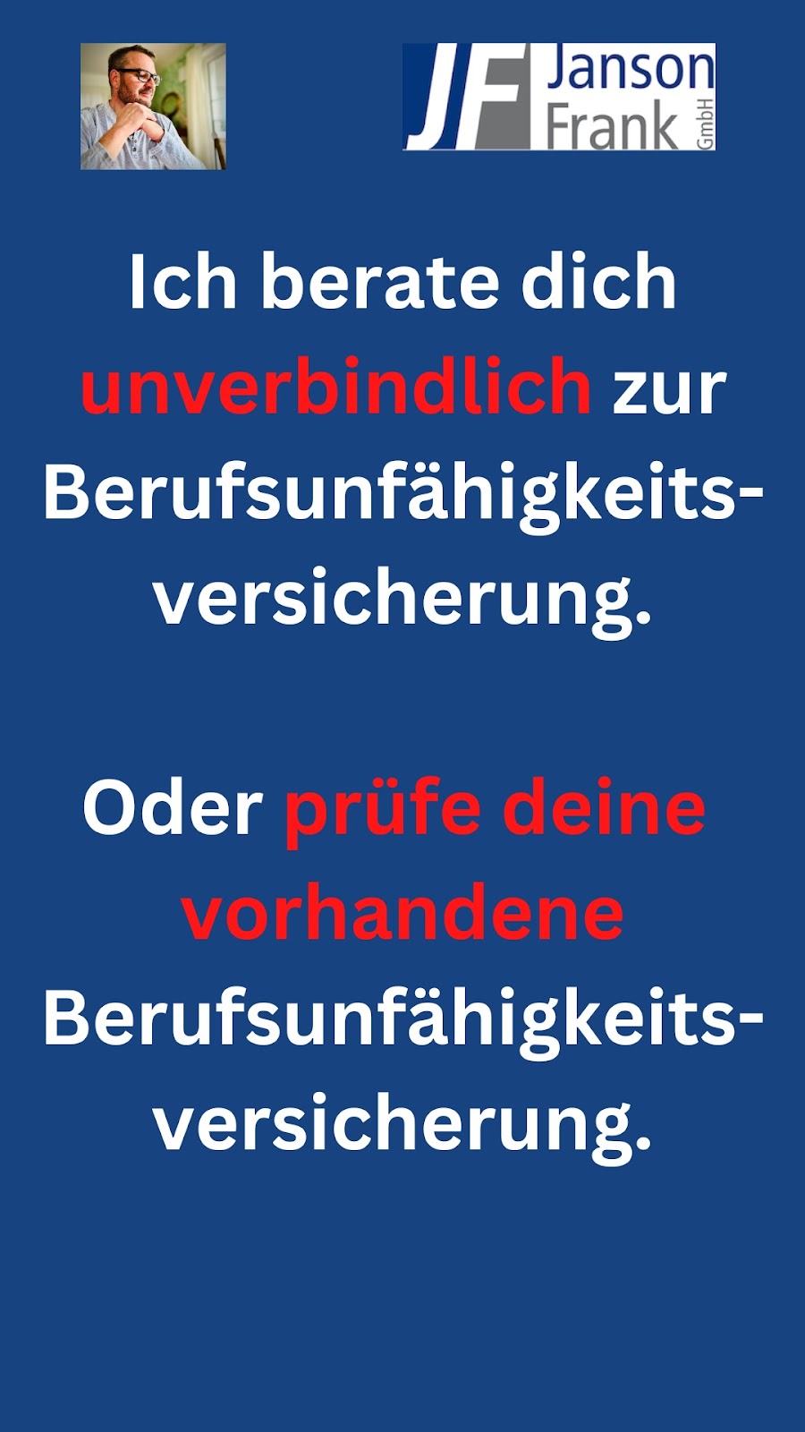 Herr Janson bietet eine gute Beratung, zugeschnitten auf die persönliche Situation und kümmert sich immer zeitnah um dringliche Anliegen. Zudem ist es sehr vorteilhaft einen digitalen Versicherungsordner über ein Portal zu nutzen, anstelle des schweren, oft unübersichtlichen eigenen Ordners zu Hause. Sehr freundlich und kompetent und absolut empfehlenswert…