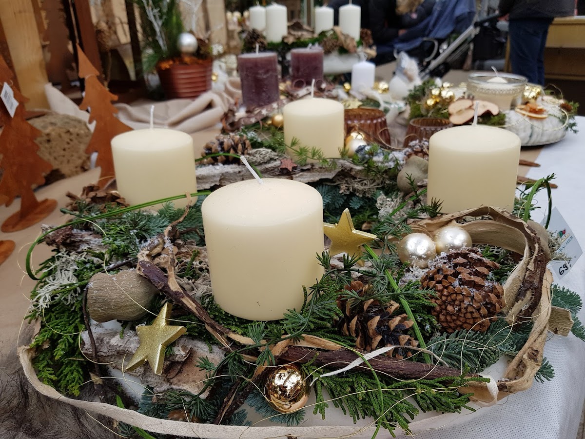 Heute war wieder Adventsausstellung, wie jedes Jahr. Schöne Arrangements, Adventskränze und Gestecke, geschmackvoll dekoriert. Außerdem Bratwurstsemmel und Glühwein für einen guten Zweck, schön vorweihnachtlich! Für nächstes Jahr vormerken!