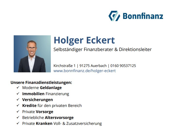 Als langjähriger Kunde von Holger Eckert bei Bonnfinanz möchte ich gerne meine positiven Erfahrungen teilen: 1. Kompetente Beratung: Herr Eckert ist meines Erachtens nicht nur ein Experte in seinem Fachgebiet, sondern auch ein hervorragender Zuhörer. Er hat meine individuellen Bedürfnisse genau erfasst und mich perfekt beraten. Zwar kenne ich mich auch gut bei Versicherungen aus, aber er hat mich dennoch auf Stolpersteine und Themen, die ich parallel zu meinem Anliegen beachten sollte, hingewiesen. Dafür hat er sich Zeit genommen. Das möchte ich vor allem als positiv herausstellen, da ich bei anderen Versicherungsunternehmen auch schon mal das Gegenteil und somit Massenabfertigung erlebt habe. 2. Zielgenaue Abfrage meiner Belange: Bei unserem Gespräch hat Herr Eckert gezielt nach meinen Zielen und Wünschen in Bezug auf den von mir avisierten Versicherungsumfang gefragt. Seine Fragen waren präzise und auf den Punkt. Dadurch konnte er maßgeschneiderte Lösungen anbieten. Ich musste mich nur am Schluss zwischen verschiedenen, ausführlich erklärten Optionen entscheiden. 3. Sympathisches Gespräch: Die Atmosphäre im Büro war warm und einladend. Herr Eckert ist nicht nur ein kompetenter Berater, sondern auch ein sympathischer Mensch. Seine freundliche Art hat das Gespräch zu einer angenehmen Erfahrung gemacht. Insgesamt bin ich äußerst zufrieden mit den Leistungen des Versicherungsbüros von Holger Eckert. Ich kann es uneingeschränkt weiterempfehlen! Inzwischen habe ich fast alle Versicherungen bei ihm.