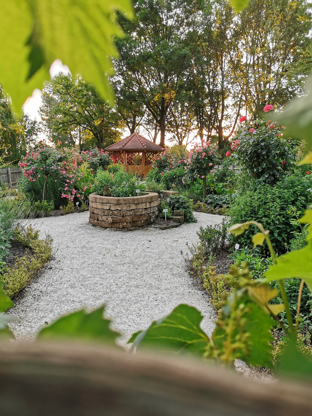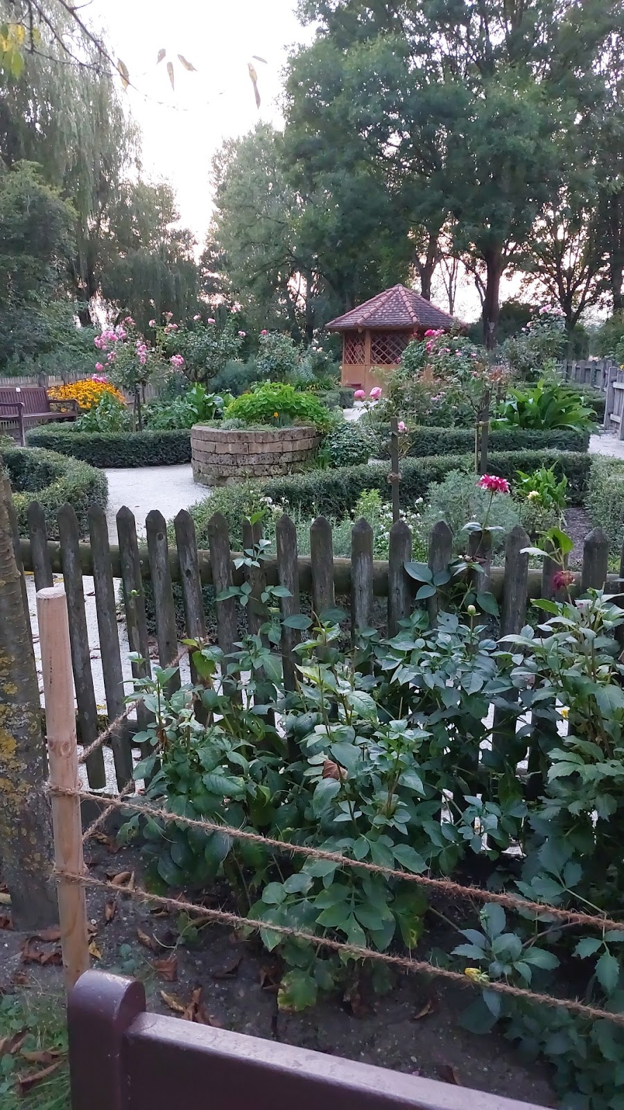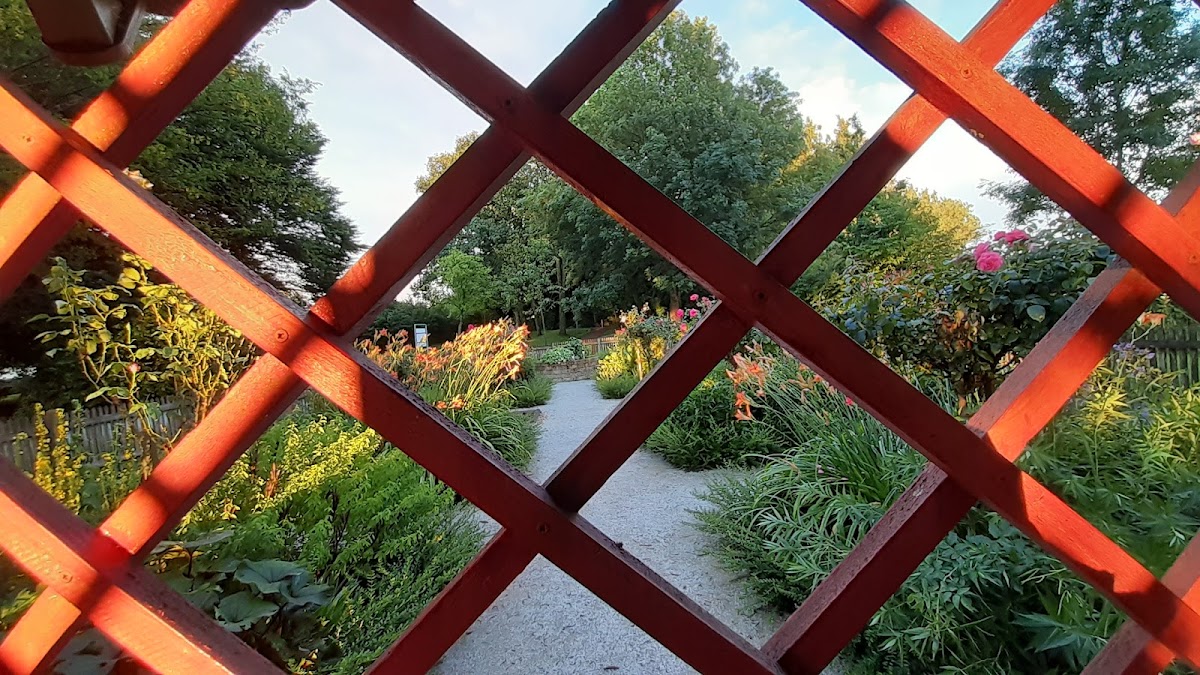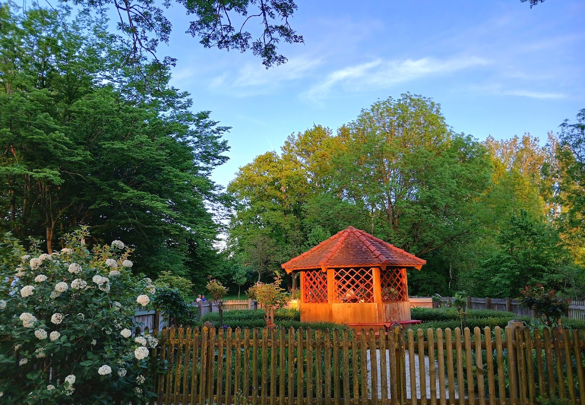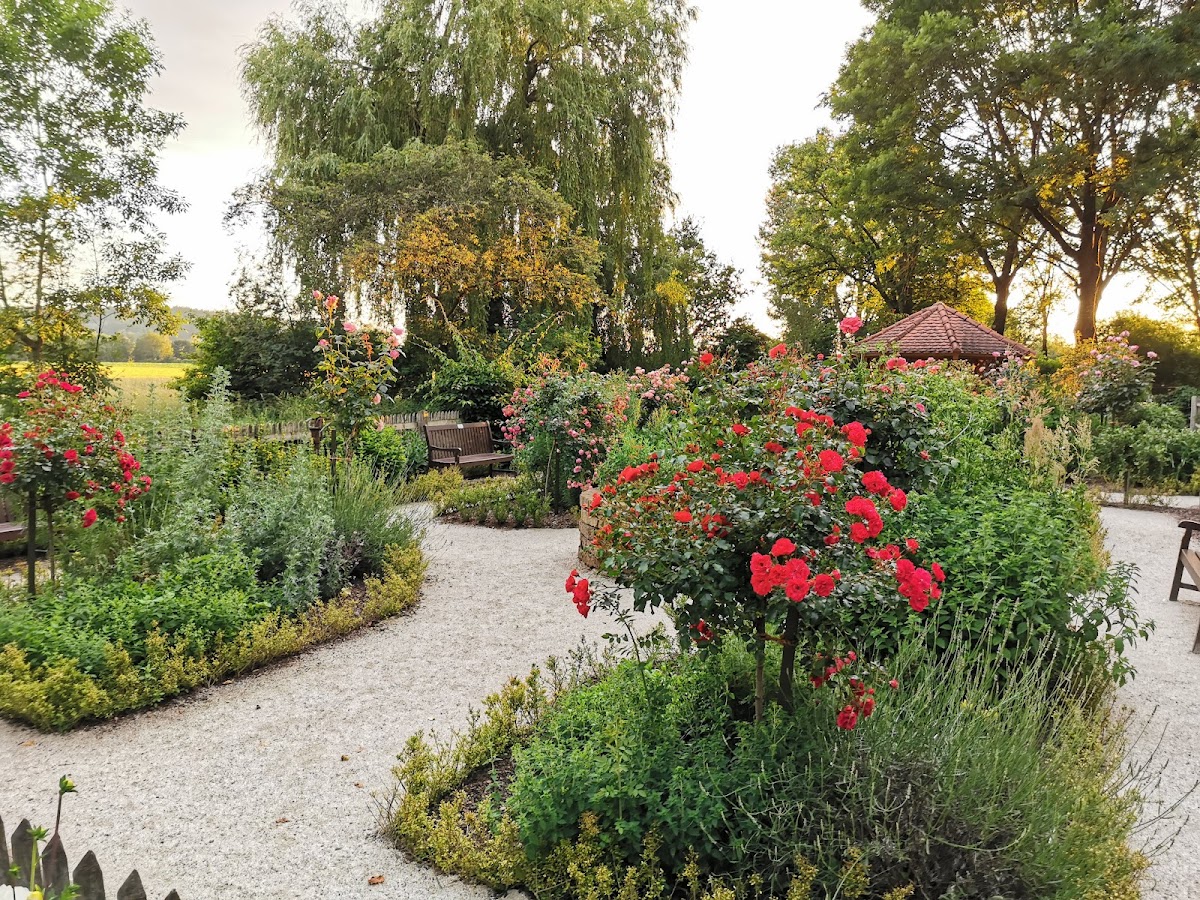 Ein ganz kleiner schöner Garten mit verschiedenen Blumen und vielen Kräutern, die mit Namensschildern versehen sind. Es gibt auch zwei Bänke und einen kleinen Pavillon zum Verweilen.