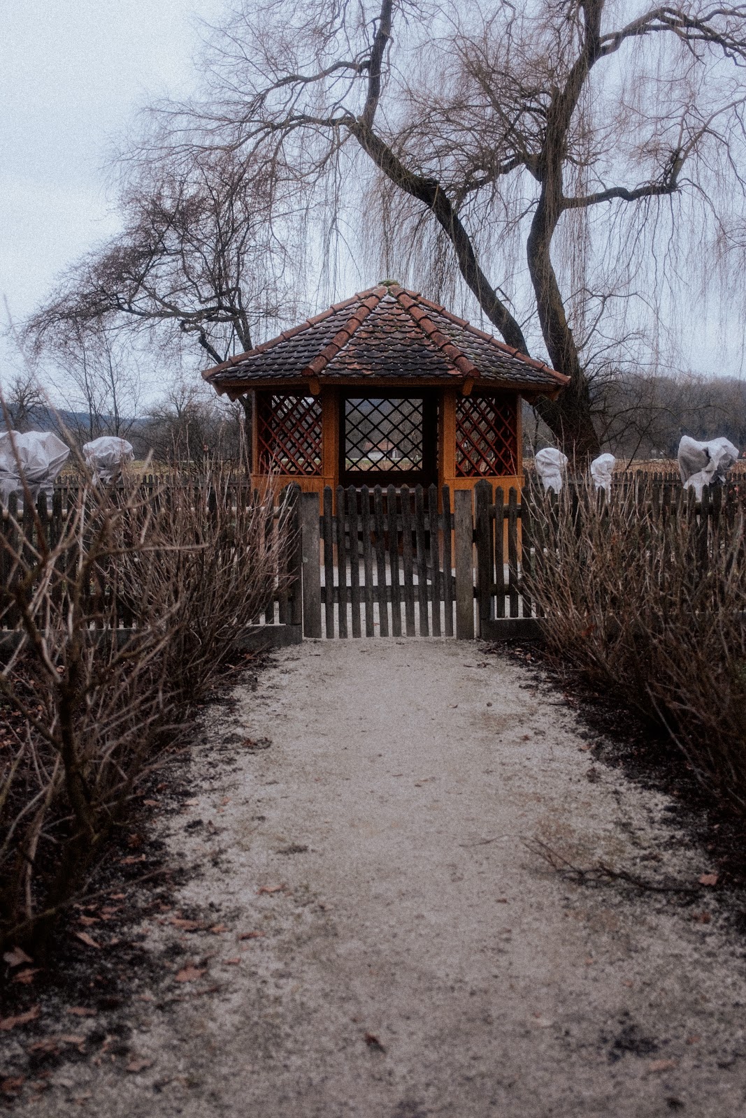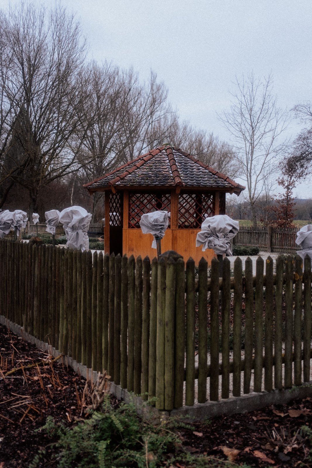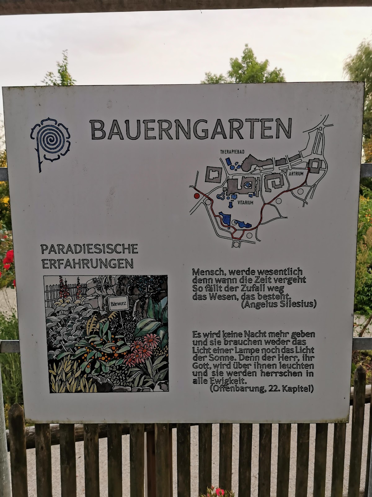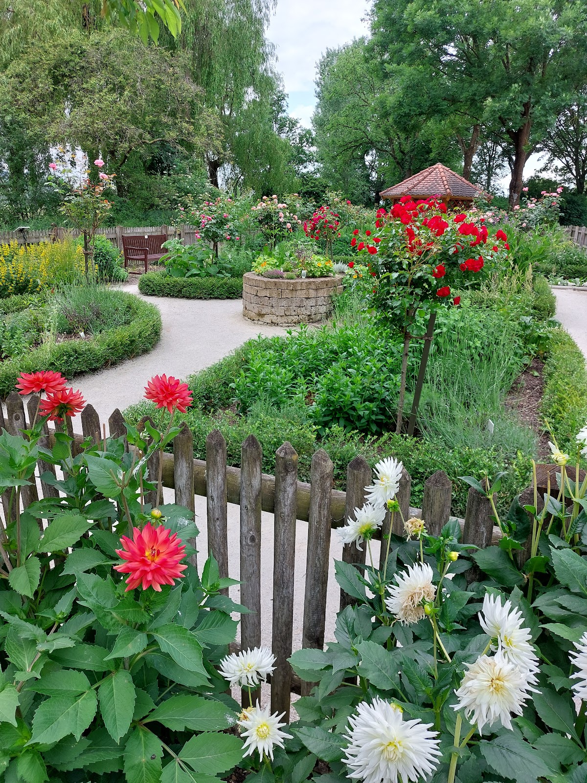 Ein ganz kleiner schöner Garten mit verschiedenen Blumen und vielen Kräutern, die mit Namensschildern versehen sind. Es gibt auch zwei Bänke und einen kleinen Pavillon zum Verweilen.