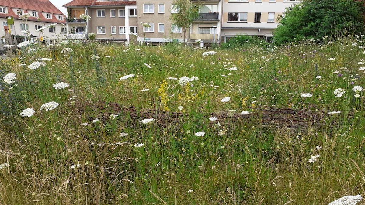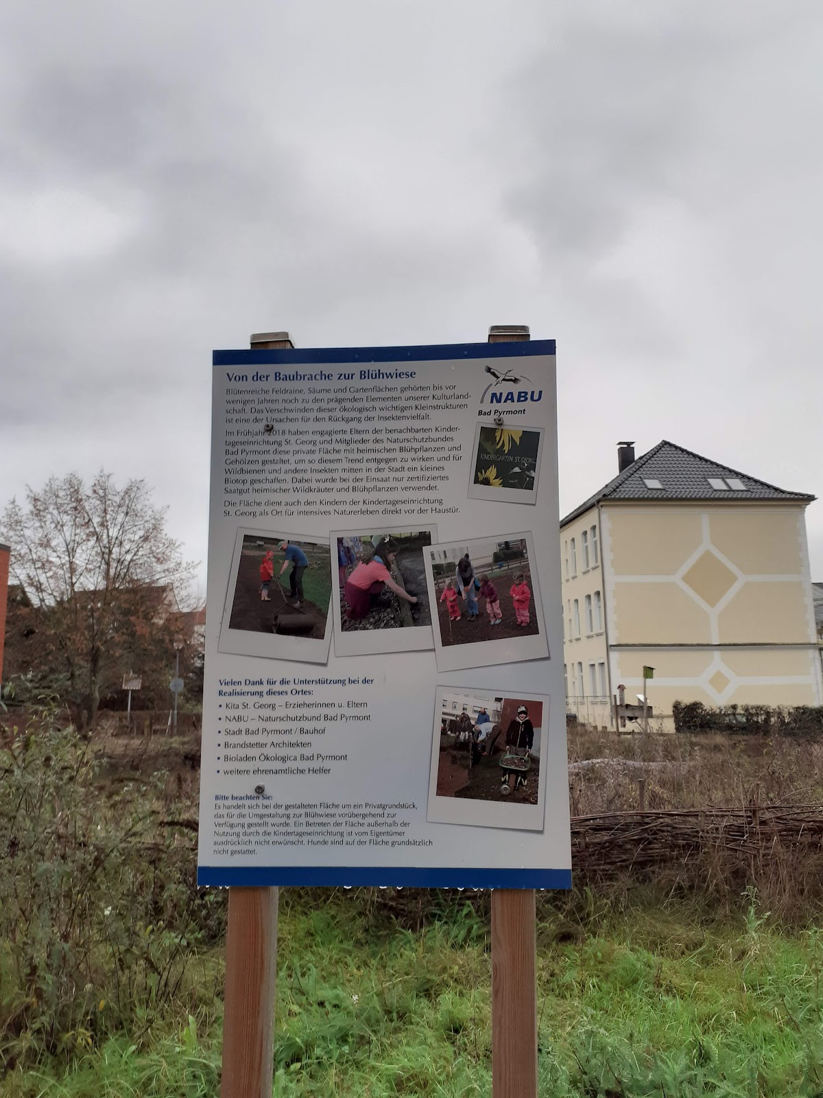 Auf dem schwammigen Untergrund dieses Grundstückes konnte damals die gegenüberliegende Post kein neues Gebäude bauen.Der NABU organisierte mit verschiedenen Pyrmontern, des Bauhofes der Stadt Pyrmont und in Zusammenarbeit mit den Erziehern und Eltern der Kita St.Georg die Bepflanzung dieser Blühwiese.So wurde hier ein Biotop für Insekten und Wildbienen geschaffen und dieser Wildgarten dient für die Kinder der Kita auch als Naturerlebnis.Mit dieser "grünen Insel" wird ebenfalls das Stadtklima positiv beeinflusst.Schon im antiken Rom und bei den "alten Griechen", die ja damals schon sehr große Städte bauten, war das Stadtklima ein Thema, denn in eng bebauten Regionen sind die Belüftungsschneisen eingeschränkt. Eine Aufwärmung der Innenstadt als Wärmeinsel ist das Ergebnis einer schlechten Belüftung eben dieses Stadtkerns und ein typisches Merkmal des Stadtklimas.Eine Wärmeinsel wird durch die Lufttemperaturdifferenz zwischen der wärmeren Stadt und dessen kühlere Umland charakterisiert. Das Maximum ist dann bei wolkenfreien und windschwachen Wetterbedingungen während der Nacht.Das Klima in der Stadt heißt sich dann ständig weiter auf, es wird nicht nur zu warm sondern auch die Konzentration von Schwebstoffen in der Luft erhöht sich.Das würden nicht nur Kranke merken, sondern mit der Zeit würden alle Bewohner der Innenstadt darunter leiden.Überhaupt sollte eine zivilisierte Gesellschaft gegenüber der Umwelt schon von Kindesbeinen an sensibilisiert werden , z.B. auch bei dem Thema Zigarettenstummel . Wenn die achtlos weggeschmissen werden sterben Tiere wenn sie Zigarettenstummel mit Nahrung verwechseln.Die Stummel enthalten laut WHO bis zu 7000 verschiedene Chemikalien, die meisten sind giftig und mindestens 50 Stoffe sind krebserregend. In den Zigarettenfiltern sammelt sich ja der Großteil der im Tabakrauch enthaltenen Schadstoffe, vor allem Nikotin.Aus einem Stummel wird durch Regen knapp zwei Milligramm Nikotin in Böden und Gewässer gespült.In gebrauchten Zigarettenfiltern befinden sich, unter anderem auch Arsen, Blei, Chrom, Kupfer,Cadmium, Formaldehyd, Benzol,Nitrosamine,polycyclische aromatische Kohlenwasserstoffe, Teer und Tabakzusatzstoffe aus Resttabak.Ein Zigarettenfilter aus Celluloseacetat zersetzt sich im Süßwasser in 15 Jahren, im Salzwasser sogar erst in 400 Jahren und durch die Flüsse gelangen viele Stummel ins Meer.Hier in Pyrmont hat der NABU wiedereinmal eines seiner großartigen Projekte geschaffen, erwähnenswert ist in dem Zusammenhang auch der Kinder- Abenteuer -Indianer- Wald-Spielplatz zwischen der "m & i Fachklinik Pyrmont" und des "Königin Luise Bades".