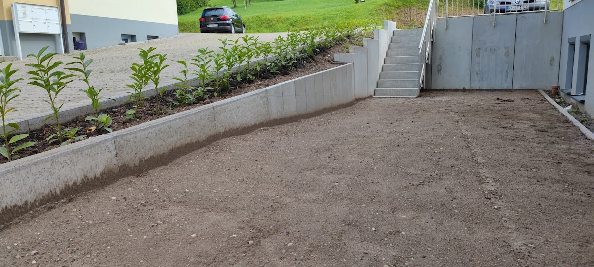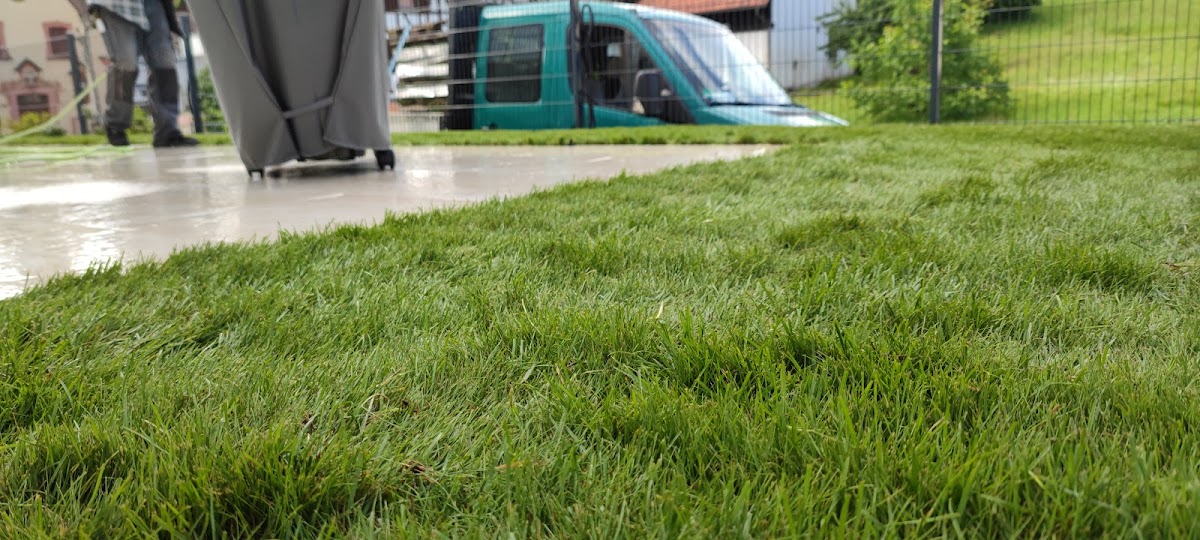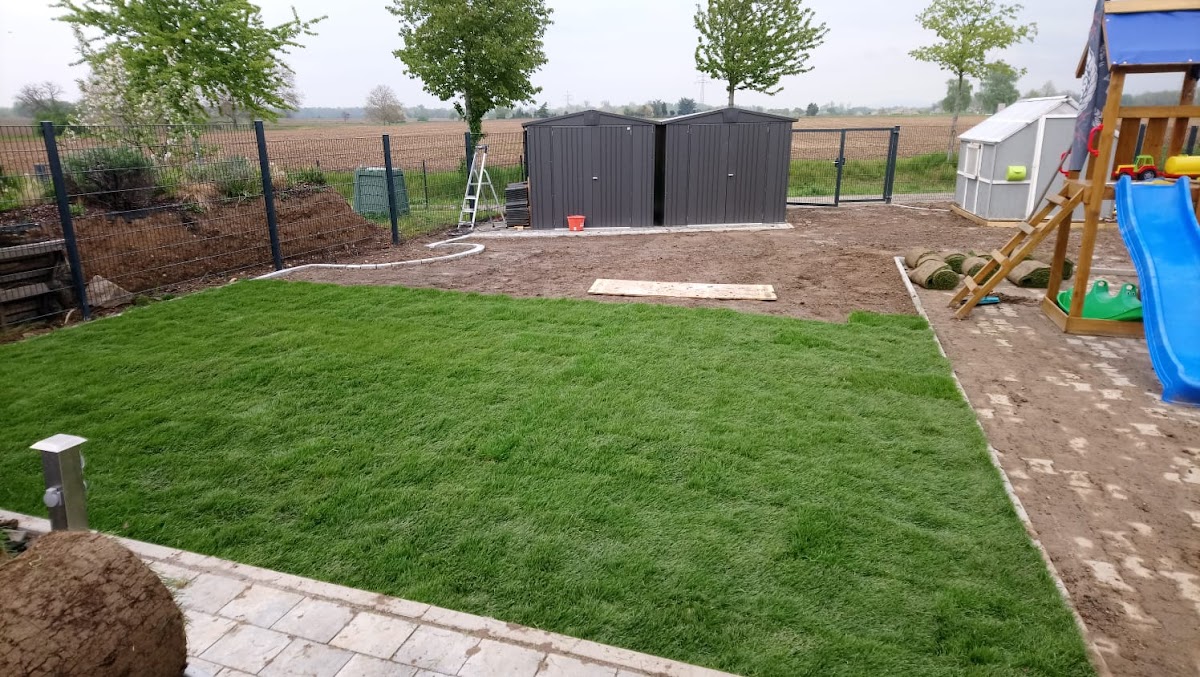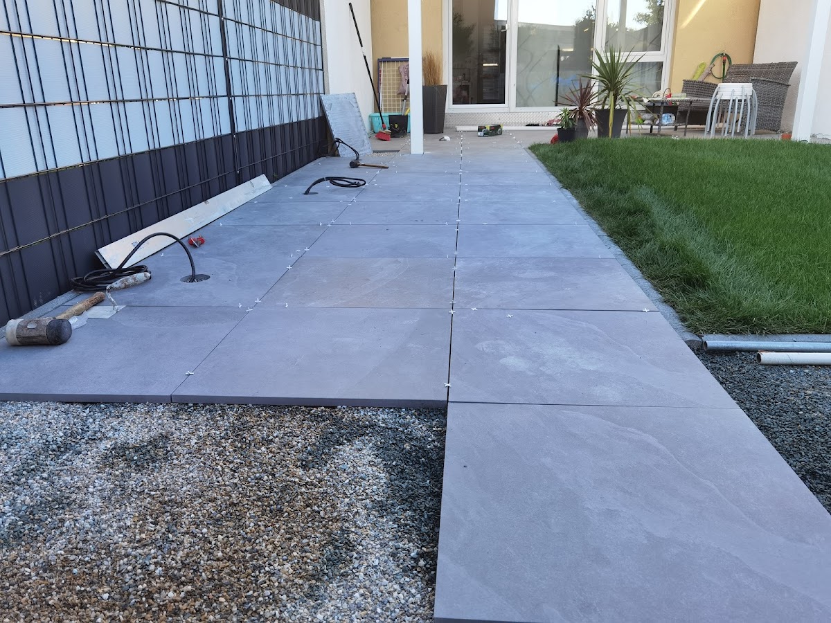 Der Rollrasen und die Terassenfliesen wurden im Spätsommer 2021 verlegt. Die Fliesen liegen auf einem Kiesbett. Die Beratung und Kommunikation mit der Firma war gut, wir sind zufrieden👍