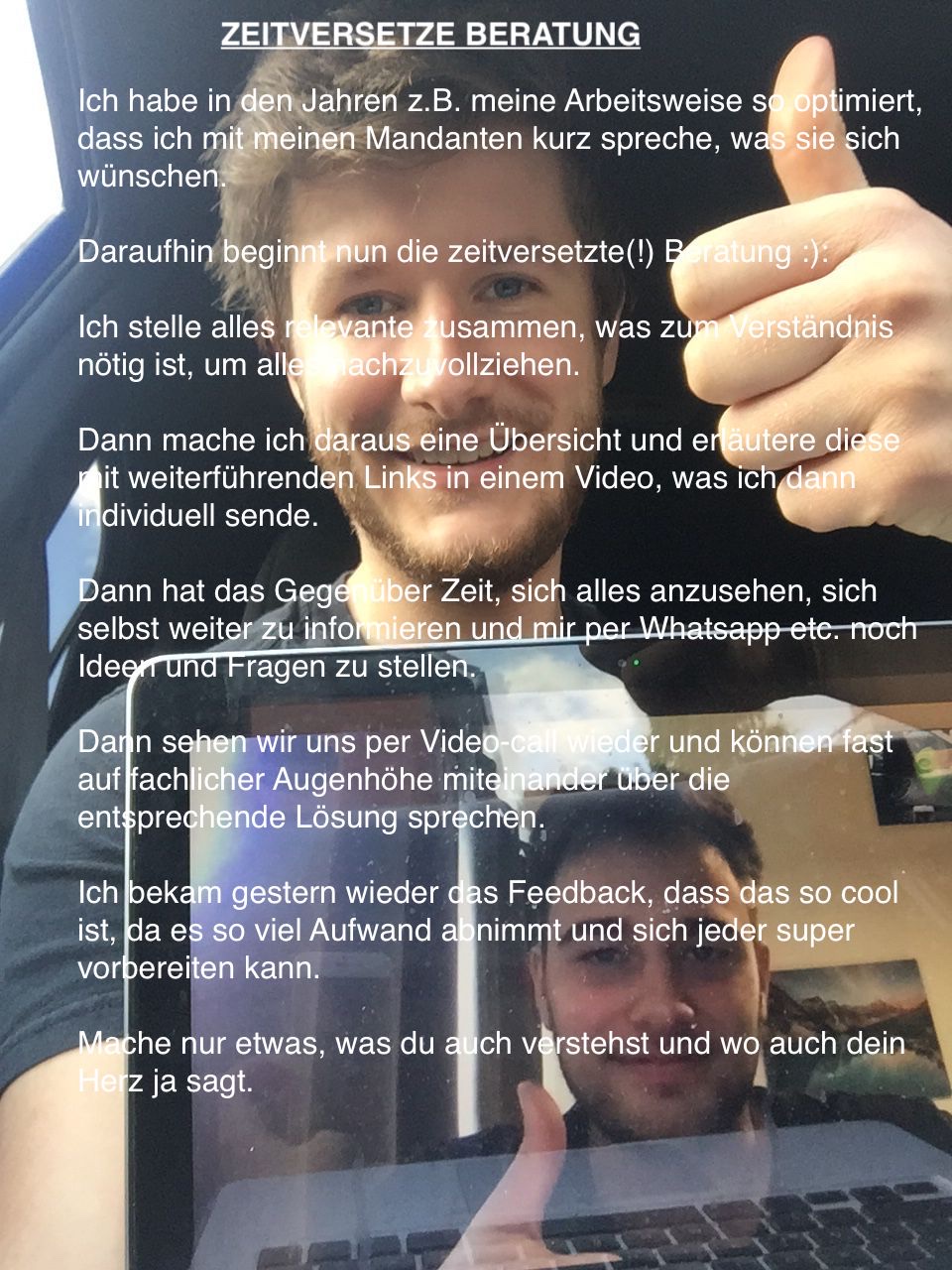 Durch die Empfehlung eines Freundes bin ich Anfang 2019 mit Marco Roth in Kontakt getreten. Seitdem berät er mich zu allen Finanzfragen, die vorher für mich nur undurchsichtiges Chaos waren. Ich kam mit dem Wunsch zu ihm, meine Versicherungen zu optimieren und mir bei Steuerfragen zu helfen. Das und noch viel mehr hat Marco mit seiner ehrlichen und kompetenten Art für mich getan. Nicht nur in den regelmäßigen Serviceterminen, auch einfach so zwischendurch gibt Marco sein Bestes, meine finanzielle Situation zu verbessern und geht immer den Extraweg, um es mir so komfortabel und sicher wie möglich zu machen. All das macht er immer auf Augenhöhe, sodass man nie das Gefühl bekommt, man wird übergangen. Sein Enthusiasmus für seine Arbeit schafft Vertrauen, ist ansteckend und macht dieses doch oft unverständliche und leidige Thema sehr viel angenehmer. Eine absolute Herzensempfehlung!