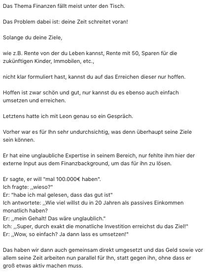 Ich bin über eine Empfehlung durch die Familie auf Marco aufmerksam geworden. Bei mir ging es in erster Linie um das Thema Altersvorsorge, das ich lange aufgeschoben und jetzt endlich angehen wollte, um einen Hacken dran zu setzen. Marco war es wichtig, dass ich mich vor dem Beratungsgespräch mit dem Thema selbst beschäftigt habe, um die verschiedenen Möglichkeiten der Altersvorsorge, sowie die jeweiligen Vor- und Nachteile, zu verstehen. Dafür hat er mir Informationen in Videoform zukommen lassen, die auch für einen Laien gut nachvollziehbar sind. Nachdem ich so meine konkreten Ziele formulieren konnte, berechnete Marco ausgehend von meiner Rentenlücke die bestmöglichen Optionen, diese zu schließen. Dabei versucht er nicht, dir „eine Versicherung anzudrehen“, sondern stellt die Rechnungen transparent und im Detail gegenüber auf und überlässt es einem selbst, am Ende eine Entscheidung zu treffen. Ich habe Marco als sehr kompetent und vertrauensvoll erlebt und kann ihn deshalb mit gutem Gewissen weiterempfehlen.