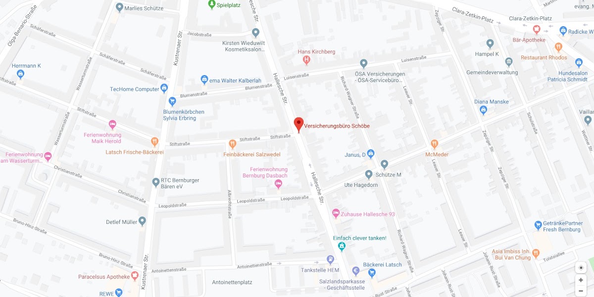 Das Versicherungsbüro Schöbe in der Hallesche Straße 67, 06406 Bernburg / Saale, bietet professionelle und individuelle Finanzberatung mit einem Fokus auf langfristige Kundenzufriedenheit. Mit einer hervorragenden Bewertung von 5.0 steht das Unternehmen für seriöse Finanzberatung Bernburg / Saale und fundierte Lösungen in den Bereichen Altersvorsorge, Versicherungen, Baufinanzierung Bernburg / Saale, Steueroptimierung und Vermögensplanung.