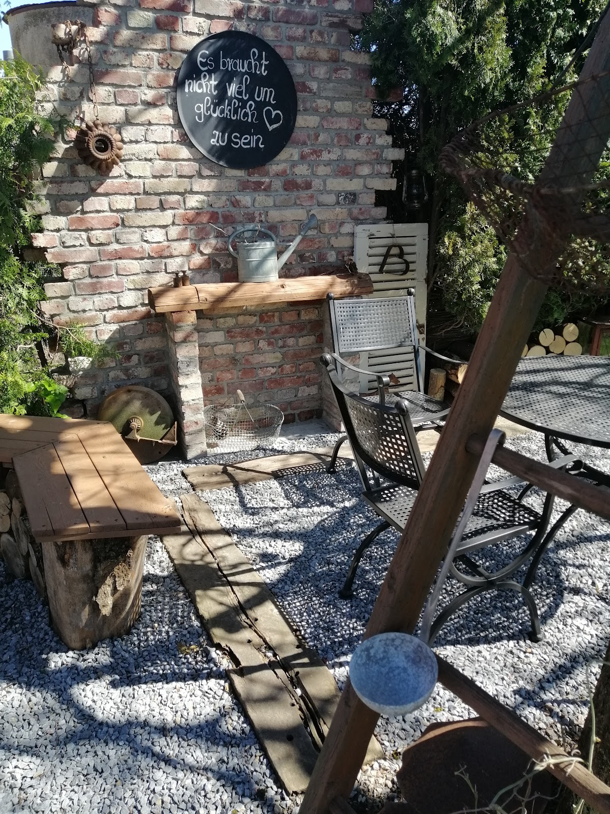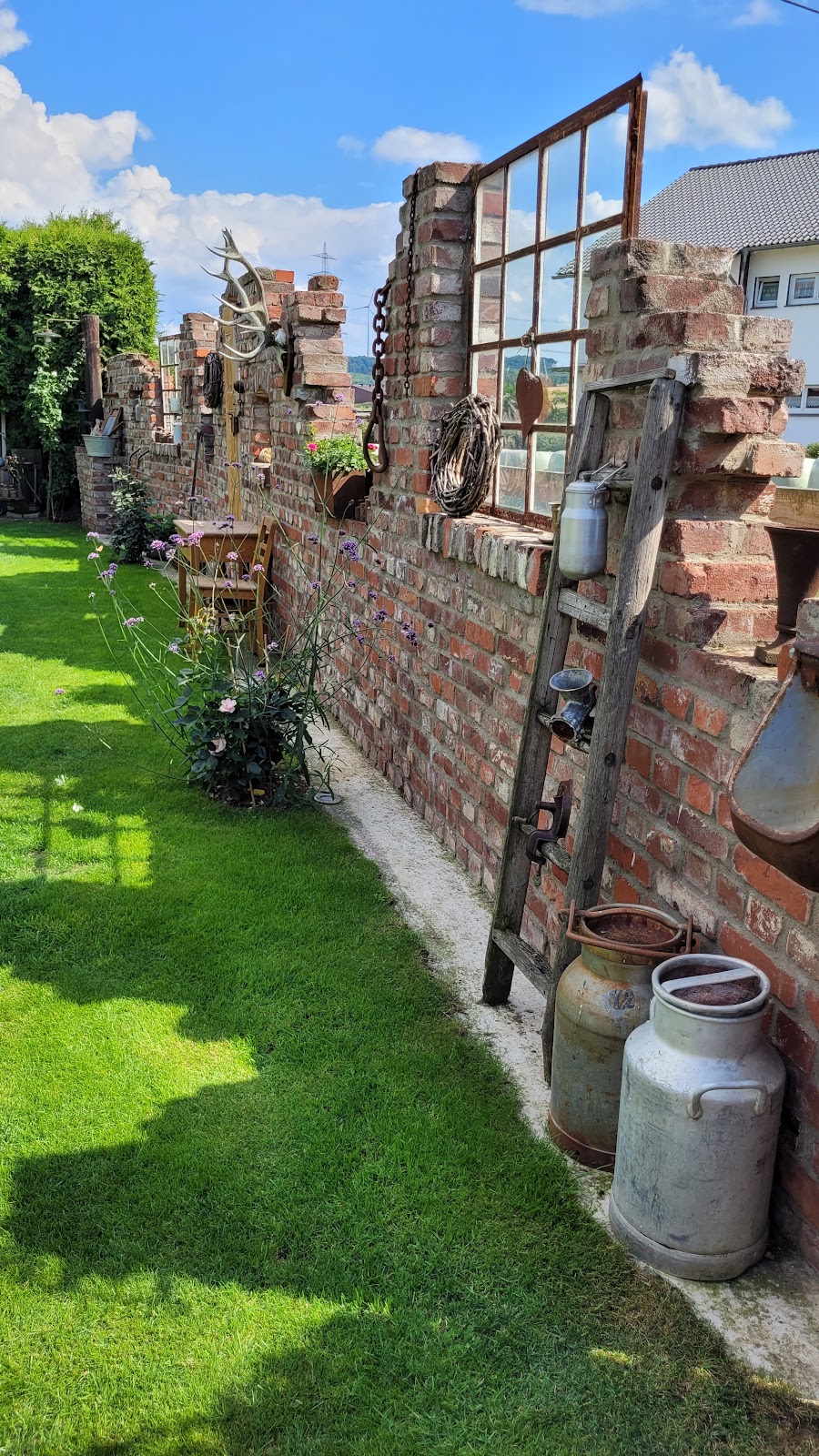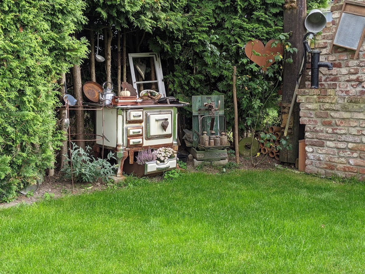 Wunderschön angelegter Garten mit vielen Sitzmöglichkeiten zum verweilen. Dort kann man Kaffee und sehr leckeren Kuchen genießen. Viele Geräte und Gegenstände aus Uroma's schaffen ganz besondere Hingucker. Sehr empfehlenswert !