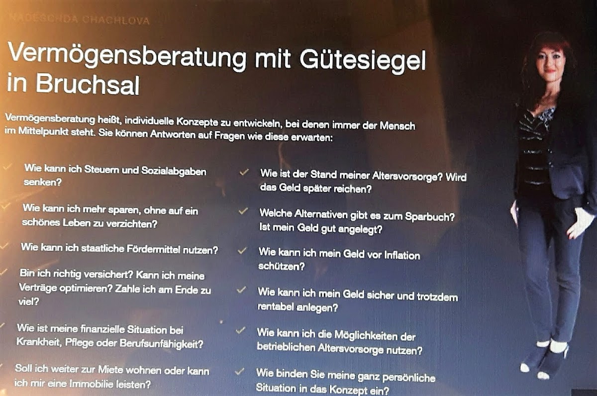 Vertrauen Sie auf eine seriöse Finanzberatung Bruchsal – kontaktieren Sie Nadeschda Chachlova Nadja Vermögensberater bei der DVAG für eine fundierte und zukunftsorientierte Planung.