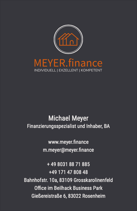 MEYER.FINANCE - EIN TOP FINANZBERATER In gut einem Jahr werden wir unser Traumhaus bauen, dafür benötigten wir eine Finanzierung. Wir waren bei vielen Finanzierungsberatern, auch bei den "bekannten" (Dr. ...) etc. ebenfalls bei unsere Hausbank und haben dort viele Stunden verbracht. Durch Zufall sind wir auf Meyer Finance gestoßen, unser Berater war Michael Meyer. Und man muss sagen, es gibt sie doch! - Die Finanzberater, bei denen der Kunde "König" ist und es Ihnen nicht nur um seine eigene Prämie geht. Schon bei dem ersten Videocall (leider war zu dieser Zeit Corinna "unterwegs" und wir haben alles per Videocall gemacht) haben wir gemerkt, er geht auf unsere Wünsche ein, hat uns die Finanzwelt erklärt und unser Optionen aufgezeigt, sodass wir für uns die passende Finanzierung gefunden haben. Bei Fragen, (davon gab es eine Menge 😀 ) war Michael immer für uns da, stand & steht uns mit Rat und Tat zur Seite und wird uns bis zum Stelltag von unserem Traumhaus begleiten. Wir können Michael Meyer von Meyer.Finance wärmstens weitermepfelen!!