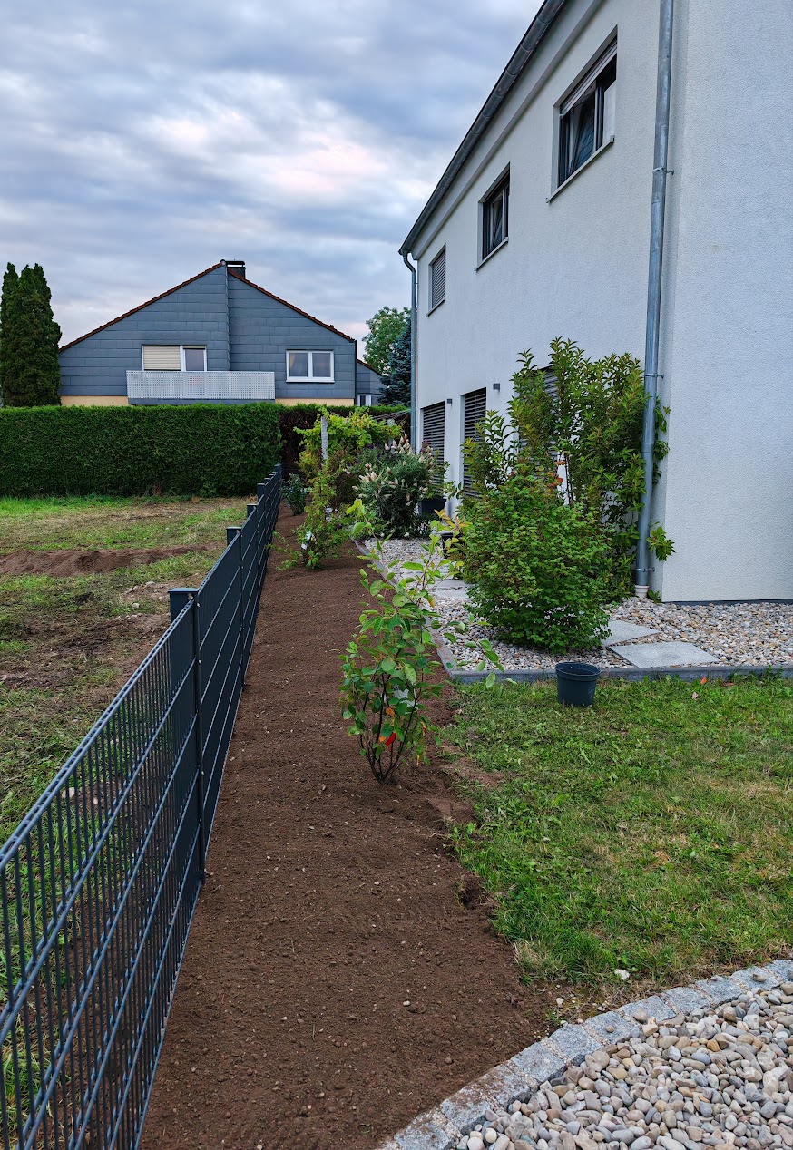 Bei uns musste der Zaun angelegt werden. Weiter wurde eine Hecke beschnitten, eine Gras- und Mähkante gesetzt, sowie vorhandene Pflanzen eingepflanzt. Die Arbeiter haben sehr sorgfältig und sauber gearbeitet. Wir waren mit den Leistungen von Herrn Freiberg sehr zufrieden.