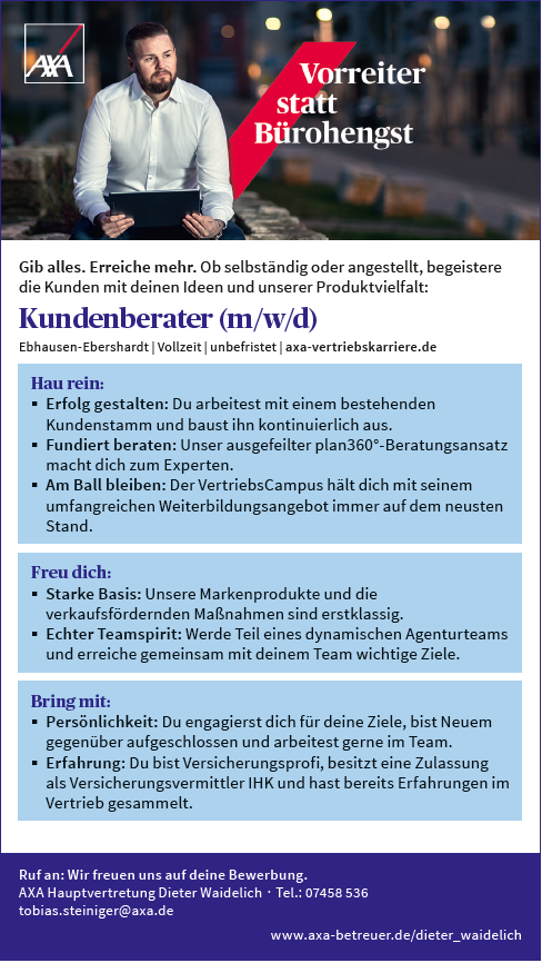 Hab schon seit langer Zeit meine Versicherungen bei AXA. Wurde bislang nie enttäuscht. Auch Herr Steiniger unterstützt mich immer bei allen Fragen und gibt kompetente Antworten. Rundum sehr zufrieden!