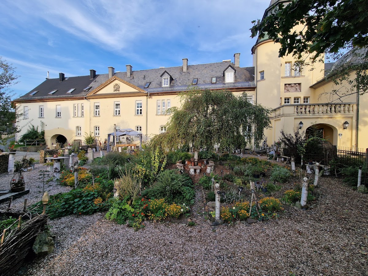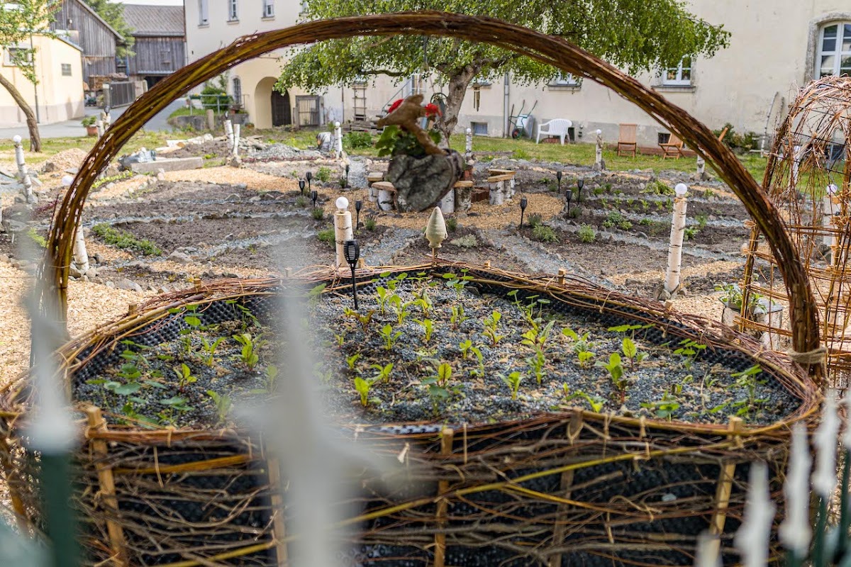 Liebevoll angelegter Kräutergarten mit idyllischen Sitzgelegenheiten. Verschiedene Kräuterbeete wurden kreisförmig angelegt und werden von wuchtigen Hochbeeten eingesäumt. Das ganze vermittelt einen märchenhaften Charakter. Einfach nur schön.