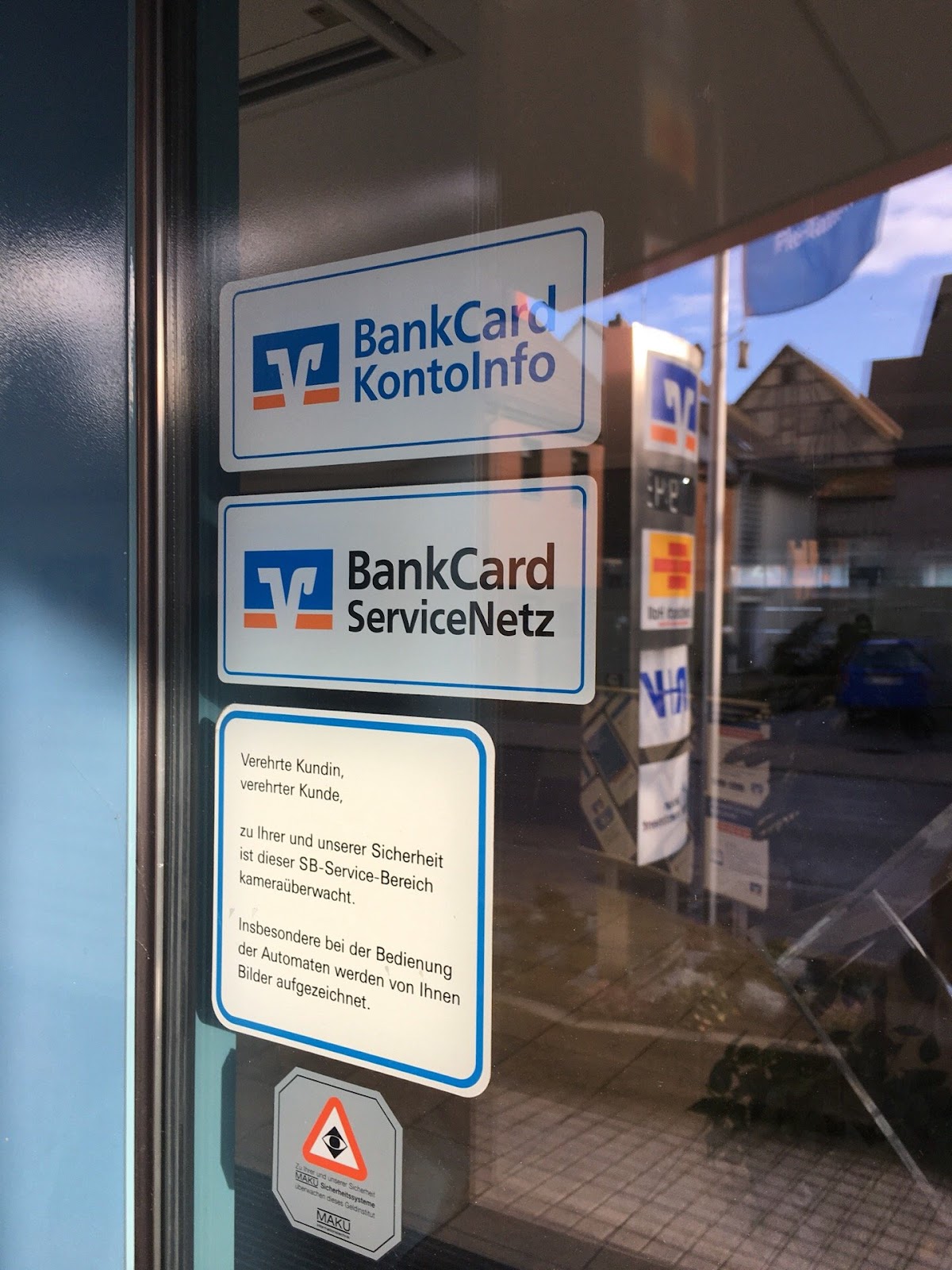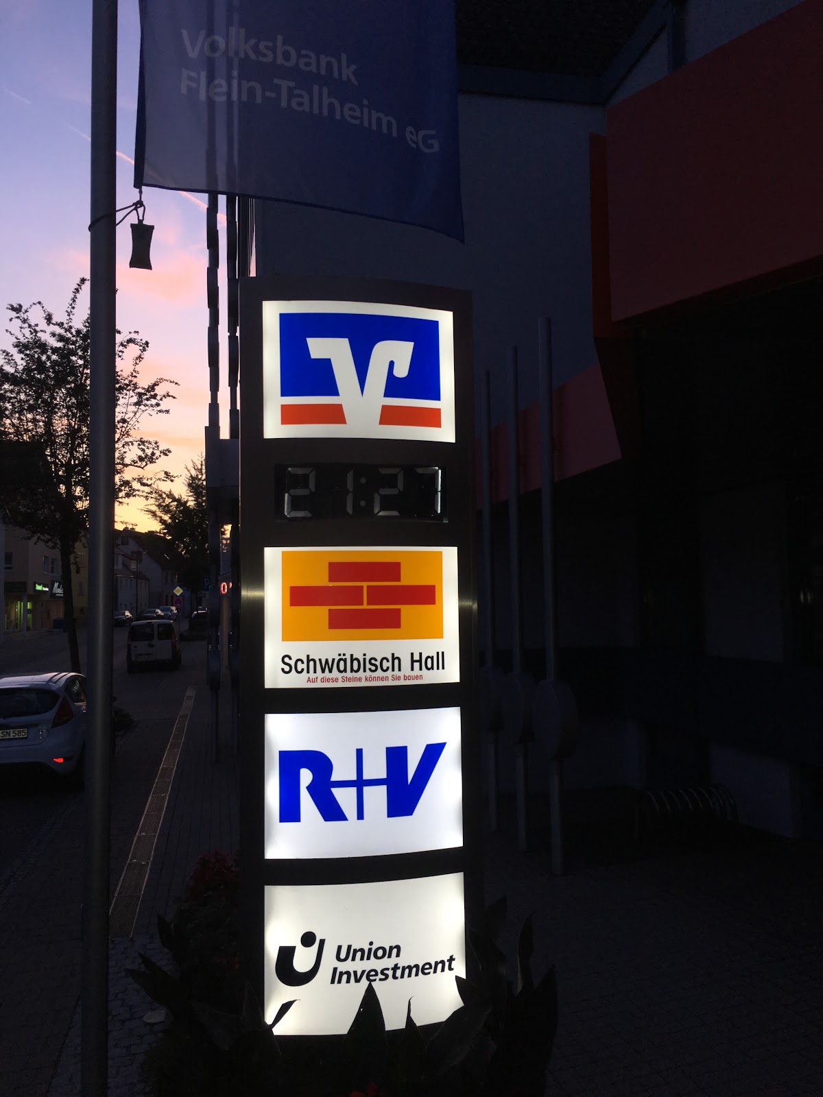 Direkt an der Durchfahrtstraße gelegen findet man die Volksbank Flein-Talheim. Ausgestattet mit Kontoauszugsdrucker und Geldautomaten. Der Selbstbedienungsbereich ist rund um die Uhr geöffnet.