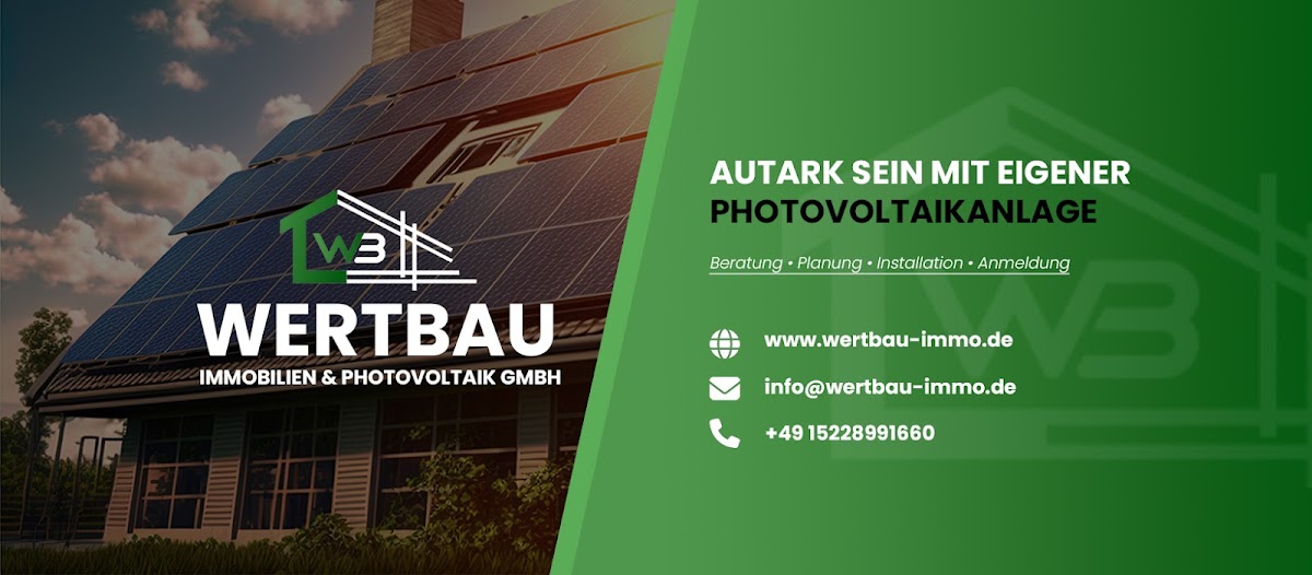 Wir sind durch eine Empfehlung aus dem Bekanntenkreis auf die Firma WERTBAU Immobilien & Photovoltaik GmbH aufmerksam geworden und können diese Firma ebenfalls nur weiterempfehlen.Schon im ersten Kontakt wurden wir kompetent und freundlich beraten. Die Anlage wurde nach unseren Anforderungen geplant. Das Angebot war deutlich besser, als die Angebote der regionalen Wettbewerber. Die Photovoltaikanlage wurde schnell und professionell montiert. Tolles und freundliches Team. Wir sind rundum zufrieden!