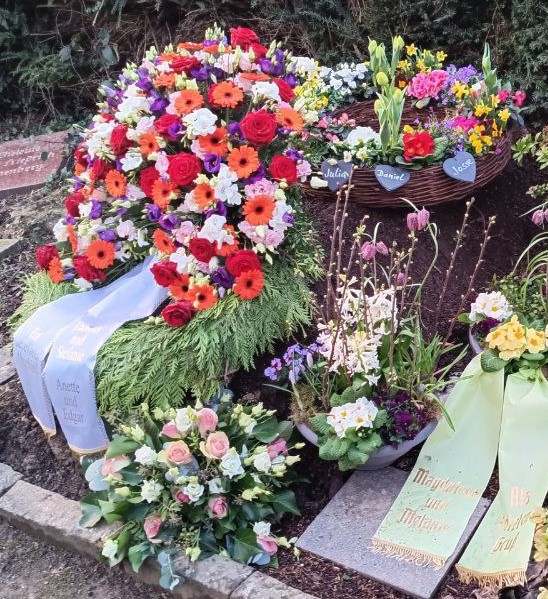 WIr haben bei der Gärtnerei Wiegang unseren Grabschmuck für die Beerdigung unserer Mama und Oma bestellt und waren wirklich sehr begeistert! Die Beratung war kompetent und freundlich und das Ergebnis genau nach unseren Wünschen: bunt und lebensfroh. Auch der kleine Extrawunsch, an den Weidenkranz (so schön!) statt einer Schleife beschriftete Schieferherzen mit unseren Namen anzubringen, wurde gerne umgesetzt. Herzlichen Dank dafür!