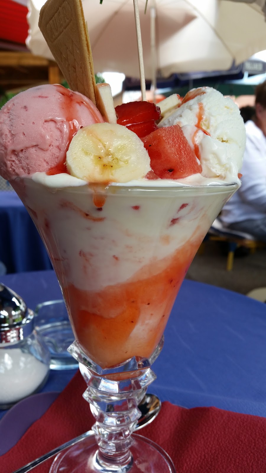 Sehr schönes Cafe und leckere Eisbecher. Personal freundlich, Aussenplätze alle mit Sonnenschirmen, bequeme Stühle, Gesamteindruck sauber, Preis/Leistung i.O., immer ein Besuch wert. Die Kuchentheke ein Paradies, davon gibt es 2 🤗. Kuchen ist selbstgemacht, kein Konditor Zeugs, und das schmeckt man auch 👍