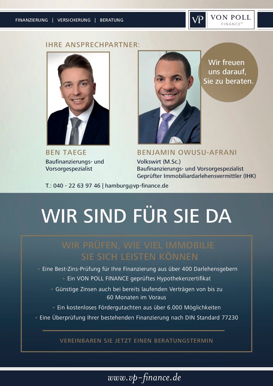 Herr Owusu-Afrani und das Team von VON POLL FINANCE Hamburg sind ein sehr professioneller Partner in Sachen Immobilienfinanzierung. Wir haben uns bei Herrn Owusu-Afrani extrem gut aufgehoben, verstanden und wert geschätzt gefühlt! Er nimmt sich Zeit, präsentiert unterschiedliche Ansätze und ist immer offen für Fragen! Wir waren nicht das letzte Mal bei ihm!