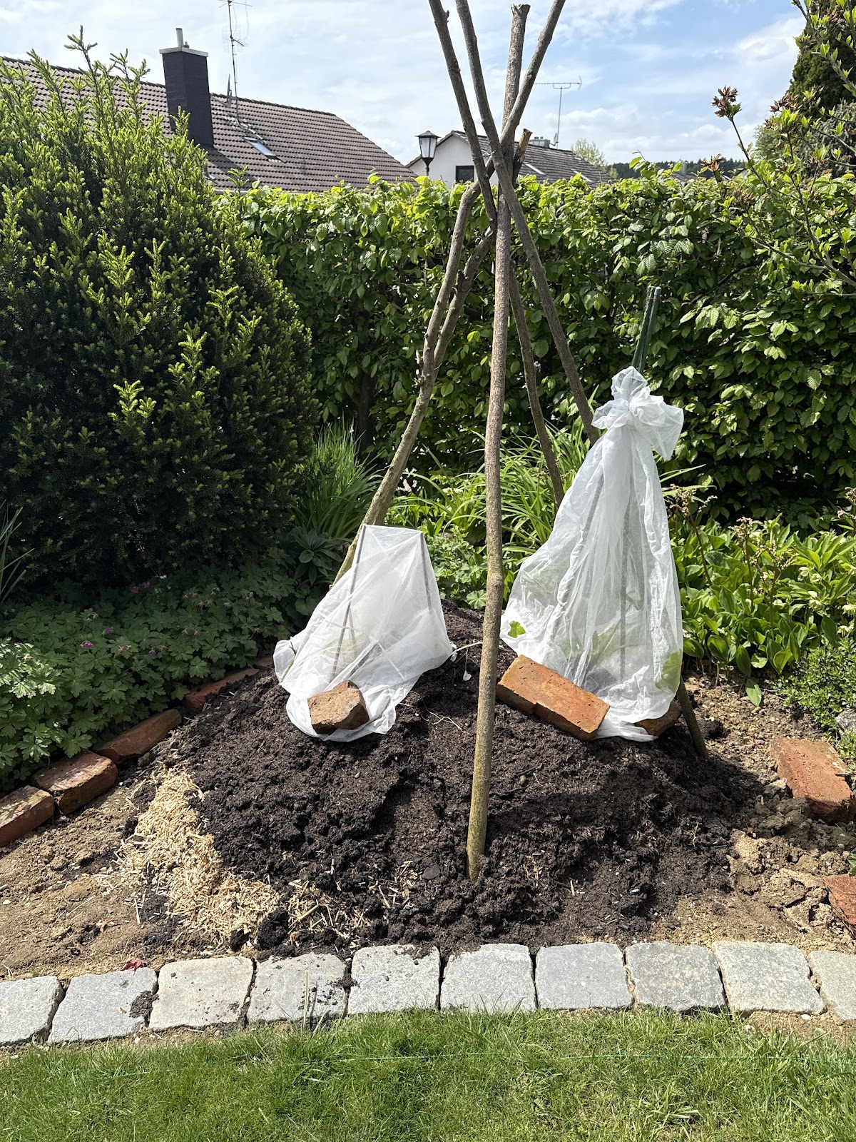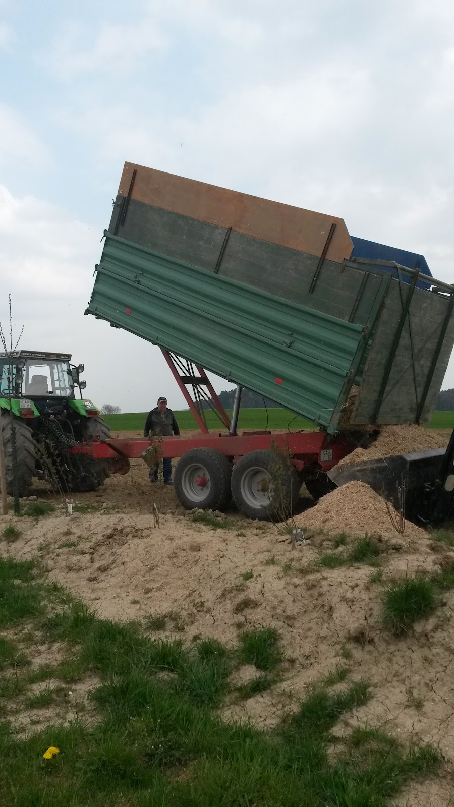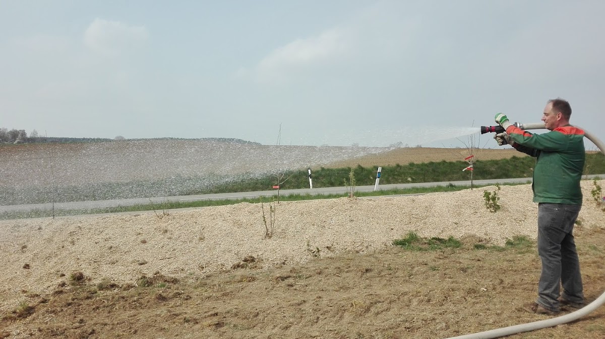 Wir haben den Miscanthus-Mulch bei einer Neuanlage in größerer Menge ausgebracht. Da die Fläche erhöht und frei liegt, haben wir den Mulch gut gewässert, damit es zu keiner Windverwegung kommt.