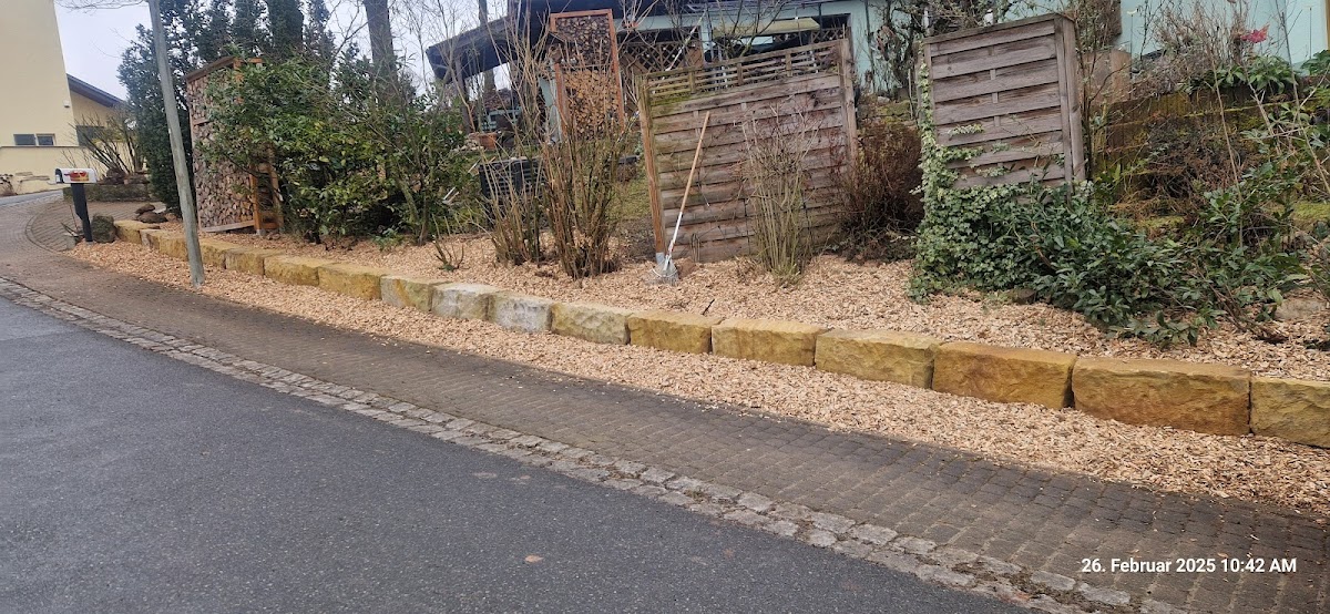 Im Februar alte Gartenmauer abgerissen, neues Fundament gelegt und ca. 12 t Sandsteine und Granitsteine neu verlegt. Altmaterial sofort entsorgt, danach Garten mit Hackschnitzel präpariert. Alles professionell geplant und umgesetzt, zwei Tage schneller gewesen, als ursprünglich geplant. Alles bestens erledigt und umgesetzt, und das bei schlechtem Wetter und schwierigen Gelände, da alles am Hang war. Sehr zufrieden, kann ich nur weiterempfehlen, auch die Bestellung und Anlieferung des neuen Materials erfolgte perfekt. Preis/Leistung passt. Nächstes Projekt bereits in Planung mit Fa. Straub. Viele Grüße, Roland König
