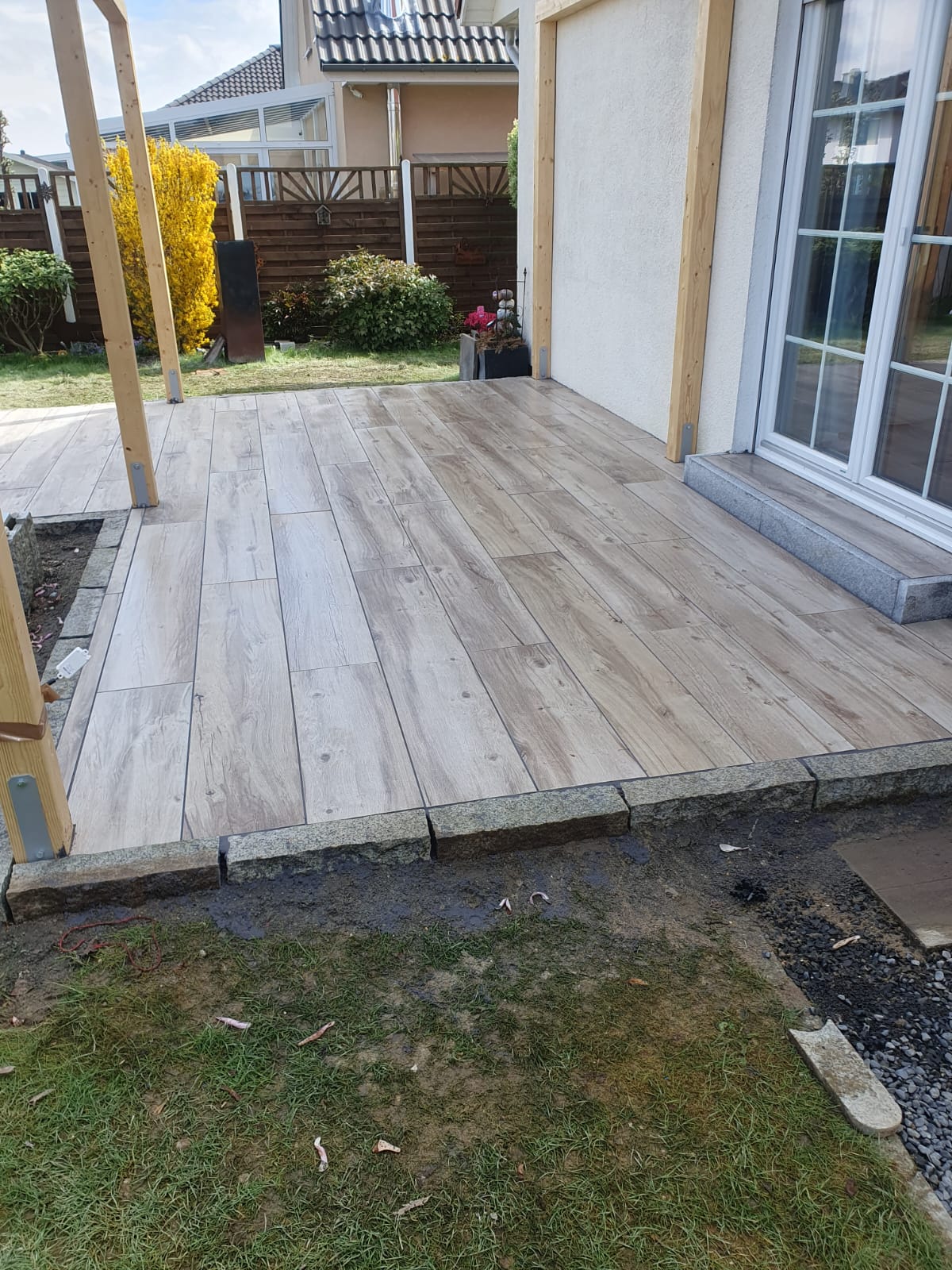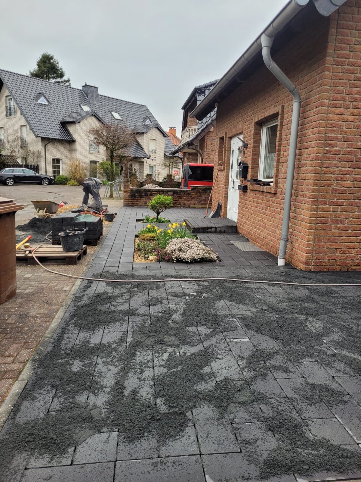 Für den Garten, Terrasse und einen seitlichen Gehweg wurde entsprechend vorhandenes Material umverteilt. Unbrauchbares Material entsorgt und für die Garageneinfahrt zum Nachbarn wurden L-Steine gesetzt. Besprochen war eine Stufe, allerdings wurden die Steine leider nicht genau gesetzt (Waagerecht), sodass das Endergebnis bescheiden aussieht. Ansonsten kann ich sagen, das schnell gearbeitet wurde, aber bei gewissen Dingen sollte man sich doch ein wenig mehr Zeit nehmen.