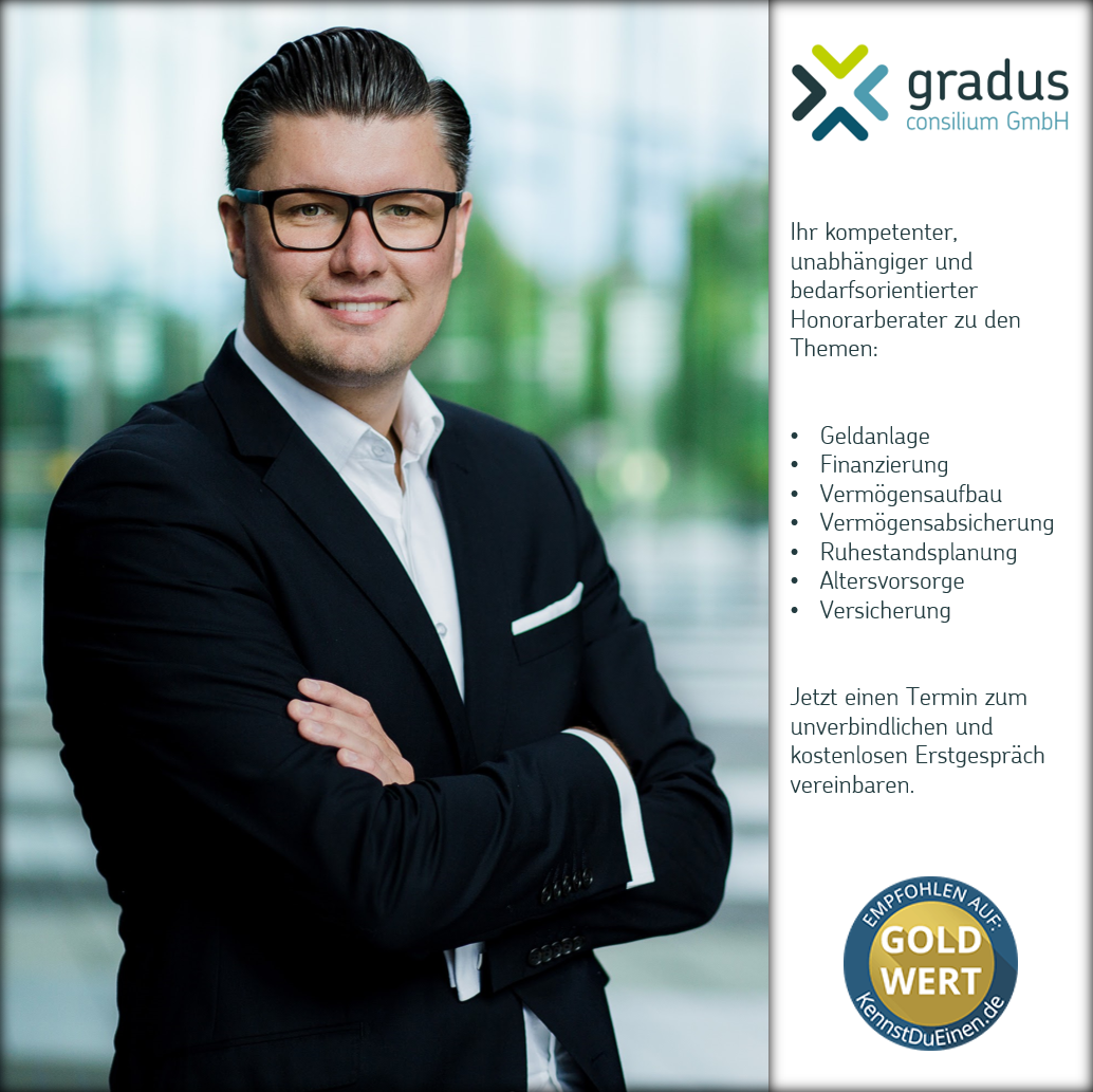 Ich habe mich bei Gradus – vor allem bei Dominik Arnoldy – von Anfang an sehr gut aufgehoben gefühlt. Die Beratung war ehrlich, kompetent und auf meine individuellen Vorstellungen abgestimmt. Herr Arnoldy nimmt sich Zeit, hört aufmerksam zu und bringt durchdachte Vorschläge mit, die wirklich weiterhelfen. Die Zusammenarbeit war durchweg angenehm, sympathisch und professionell. Insgesamt eine sehr seriöse und vertrauensvolle Beratung, die ich ohne Bedenken weiterempfehlen kann.