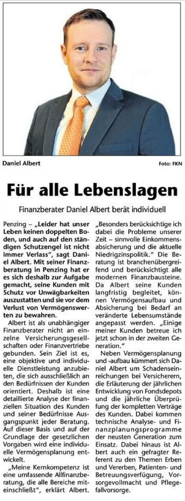 Daniel Albert hat tolle Arbeit bei unserer Immobilienfinanzierung geleistet! Er war immer erreichbar und wir konnten ein gutes Geschäft abschließen. Ich kann die Dienstleistungen von Daniel Albert nur empfehlen!