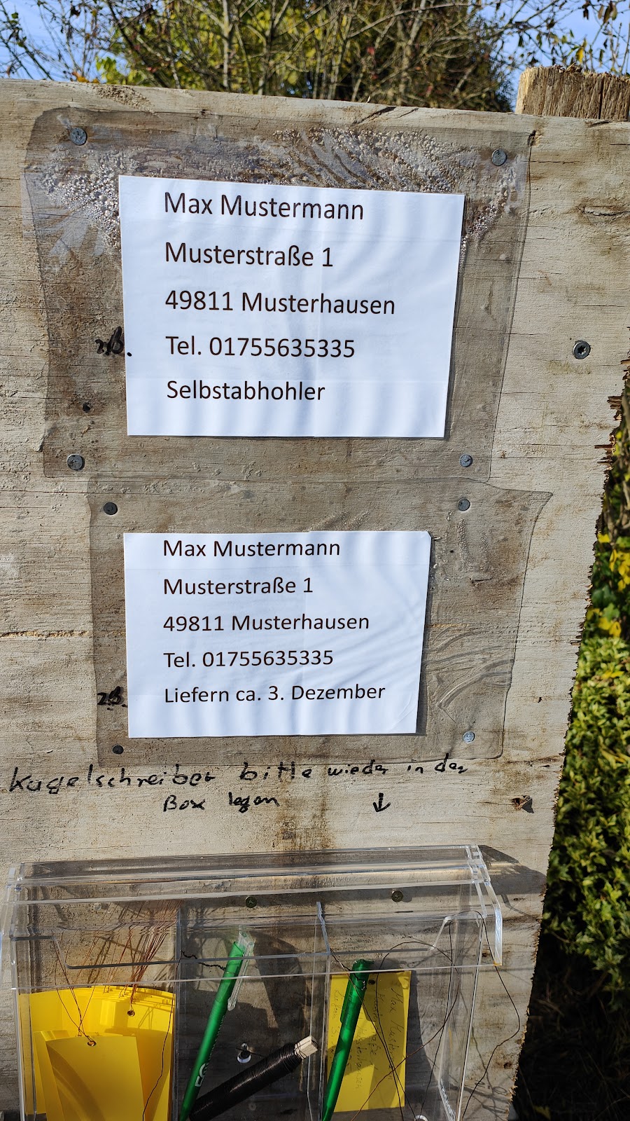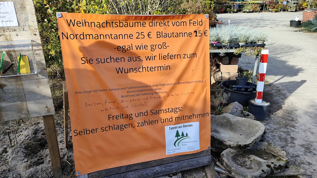 Machen jedes Jahr einen Tannenbaumverkauf mit Lieferung. Top Bäume und super nett. Wir kaufen seit einigen Jahren bei der Gartenbaumschule Albers unseren Baum. Im kommenden Jahr wollen wir dort auch noch Mal einen Obstbau kaufen.