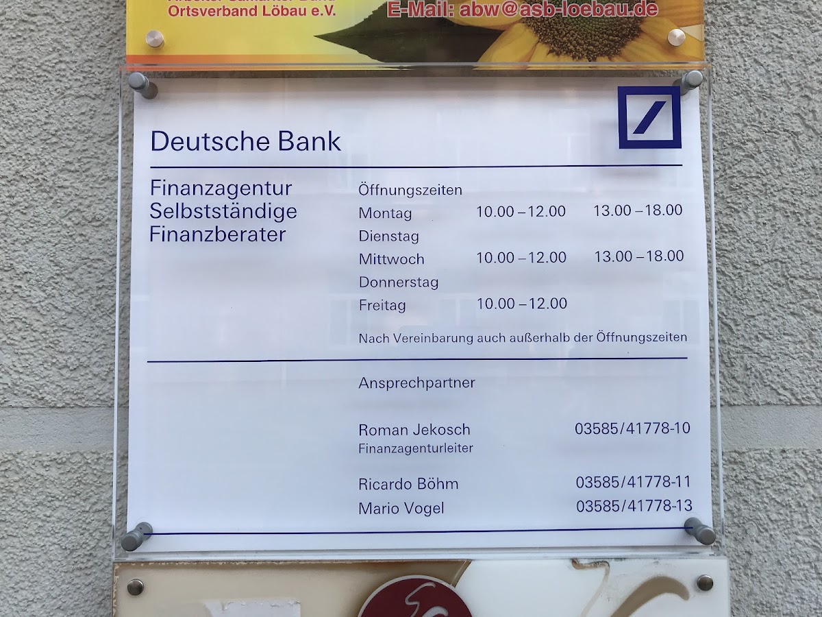 Bin seit 1996 Kunde der Deutschen Bank in Löbau. Auch wenn ich mittlerweile 700 km entfernt wohne fühle ich mich dort sehr gut beraten. Herr Böhm versteht sein Handwerk, erstklassige Beratung in allen Bereichen rund um das Thema Finanzen. Jederzeit ist er für mich erreichbar, Fragen oder Probleme werden umgehend und kompetent geklärt. Als Kunde bleibe ich sicher noch lange erhalten !! Vielen Dank Herr Böhm für die bisherige Unterstützung.