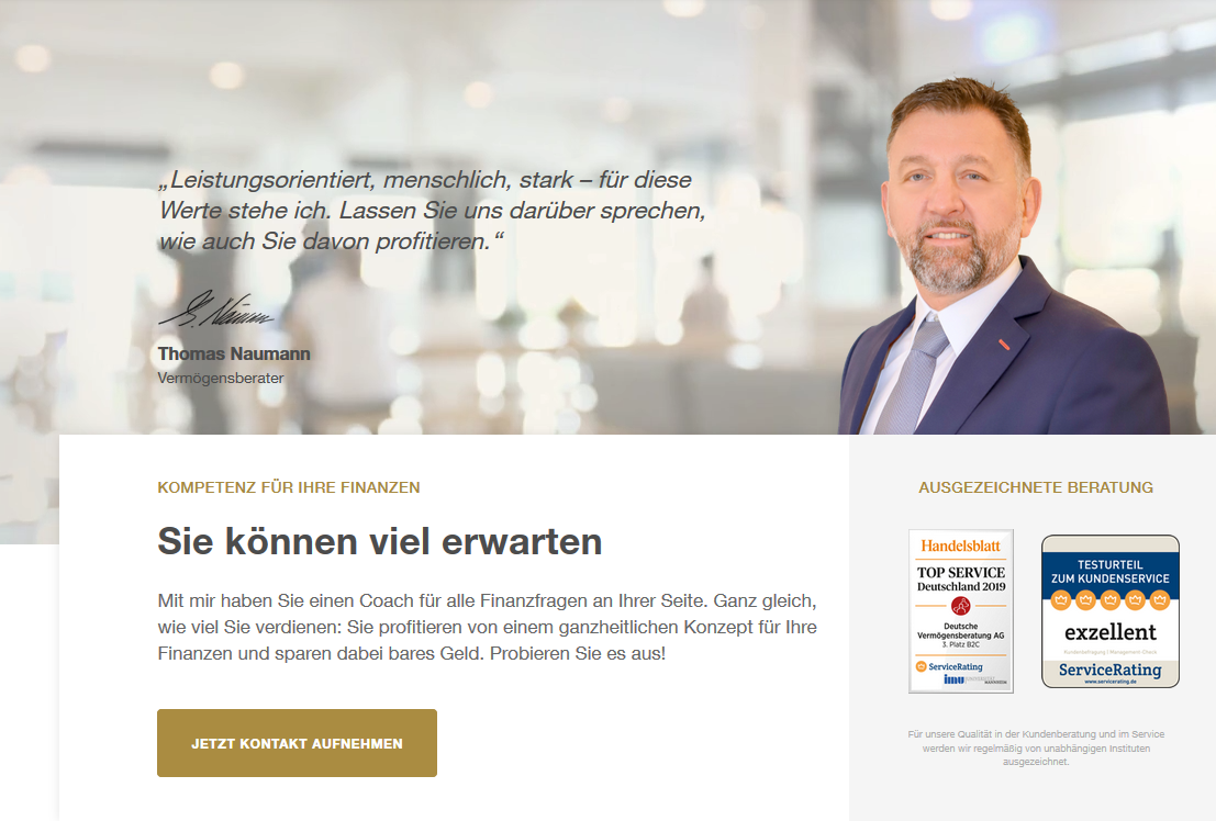 Tom Naumann berät und begleitet mich seit 2008 ehrlich, kompetent und zuverlässig in Finanz- und Versicherungsfragen. Er bildet sich beständig fort und ist immer am Zahn der Zeit. Wenn mein Produktwunsch für meine Situation falsch ist, weist er klar darauf hin, begründet seinen Standpunkt und zeigt besser geeignete Alternativen auf. Er berät so, dass die Kunden am Ende zufrieden sind und kann das anhand seiner praktisch nicht vorhandenen Stornos belegen.