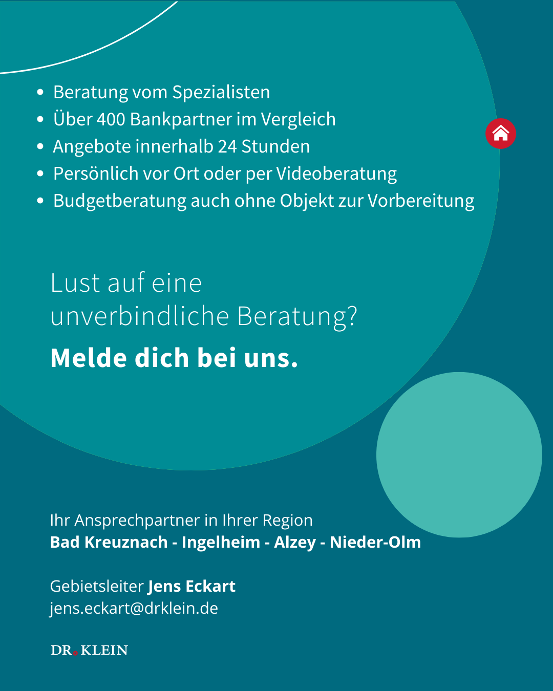 Spezialist in Sachen Baufinanzierung, angenehme Atmosphäre, Termine wurden eingehalten, Top geführtes (unaufdringliches) Beratungsgespräch, Herr Eckart war sehr gut vorbereitet, keine Frage blieb unbeantwortet. Wir fühlten uns gut aufgehoben und können Dr. Klein /Jens Eckart mit gutem Gewissen weiterempfehlen. Weiter so.