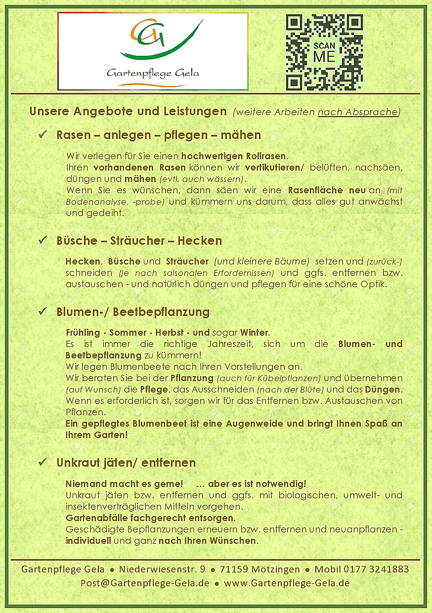 Vielen Dank. Der Rasen ist wunderschön geworden. Meine Ideen konnten durch ihre fachmännische Meinung perfekt umgesetzt werden. Sehr gute und fleißige Arbeit. Tolles Preis-/Leistungsverhältnis. Gartenpflege Gela kann ich sehr empfehlen.