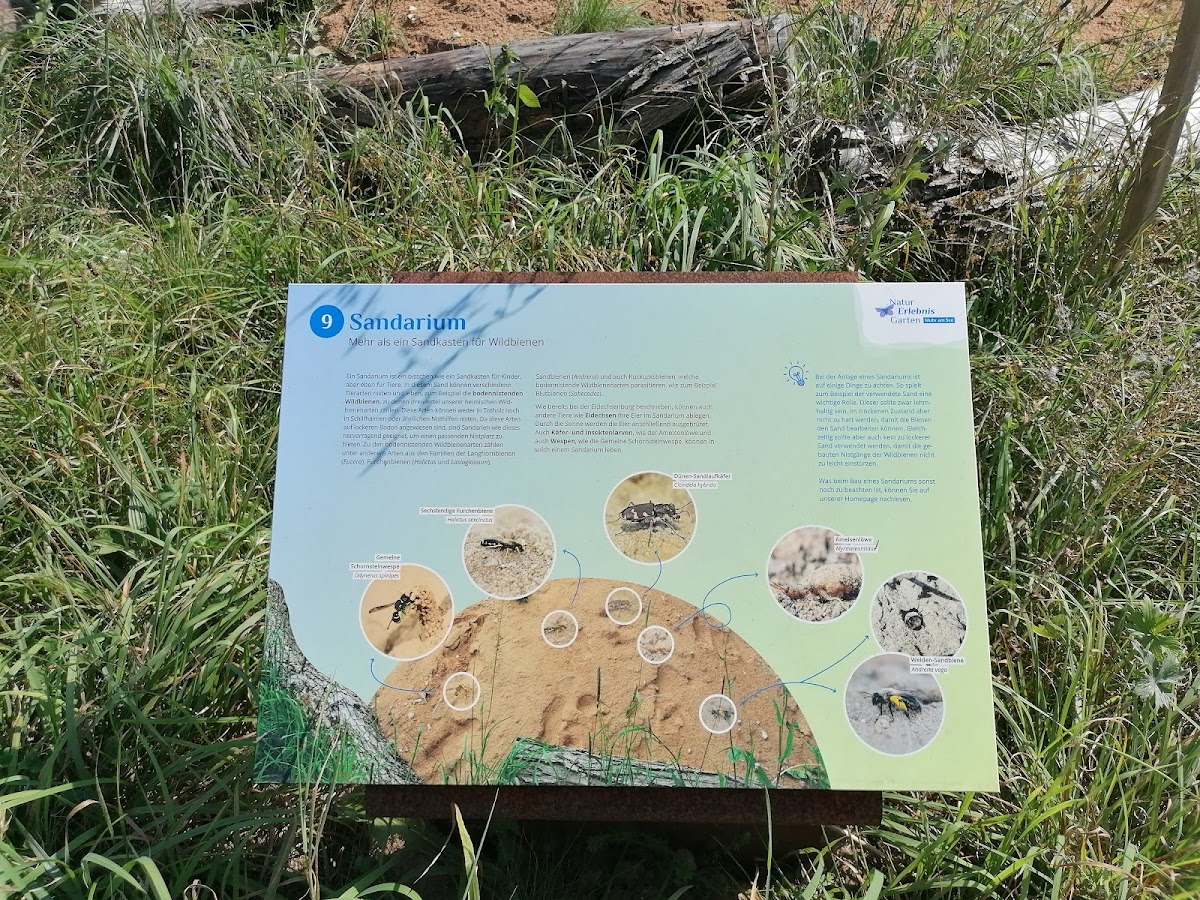 Mittels Prospekt oder Internet sind wir auf diesen Garten aufmerksam geworden. So steuerten wir ihn an einem Nachmittag gezielt an. Zu finden war er dank Navi unproblematisch. Einen ausgewiesenen Parkplatz gibt es nicht. Wir haben das Fahrzeug einfach am Straßenrand abgestellt. In diesem Natur-Erlebnis-Garten erfährt man so Einiges, z. B. über Insekten, Obstbäume, andere Pflanzen. Ich hatte vorher noch nie von einem Sandarium gehört und gelesen. Eine Naschecke mit reifen Himbeeren fanden wir auch vor. Neu für mich war auch das Wort Gumpe. Hier können nicht nur Kinder, sondern auch Erwachsene noch so Einiges erfahren bzw. lernen. Viel Zeit benötigt man für den Rundgang nicht. Aber, wer sich intensiv beschäftigt, sollte ggf. eine Stunde einplanen.