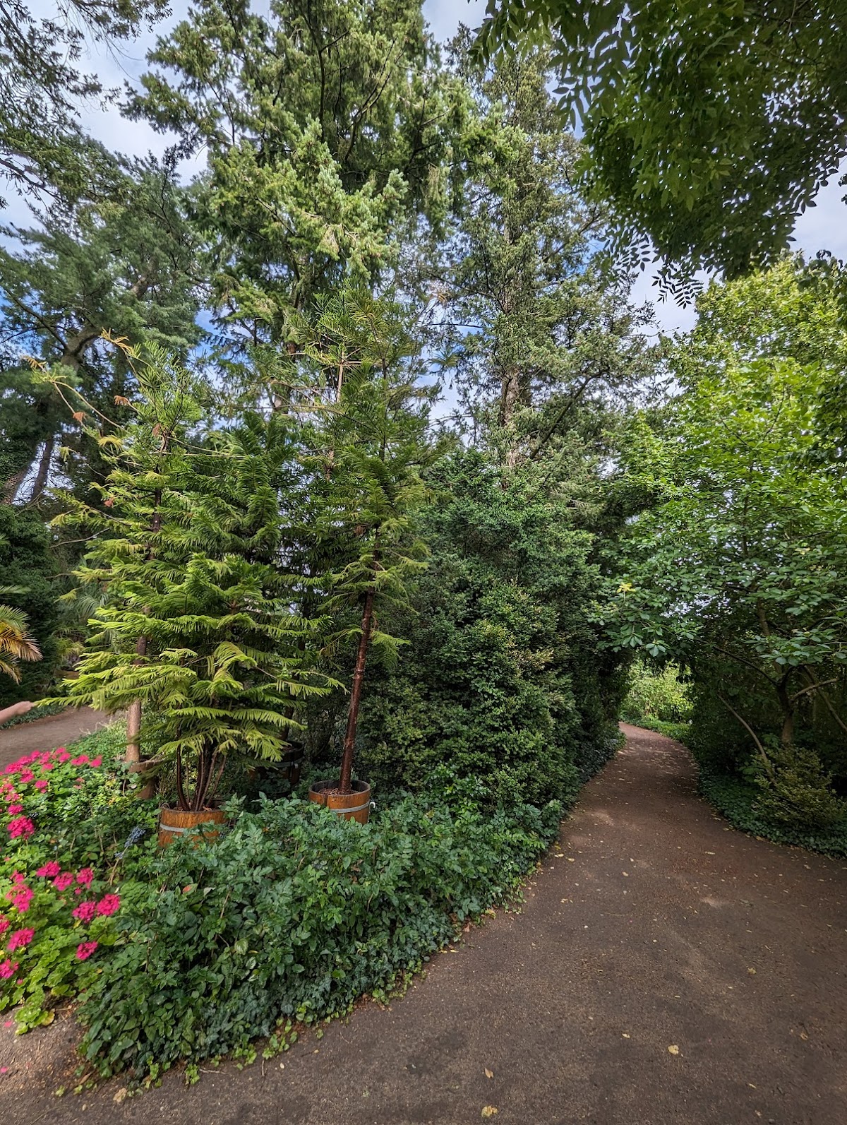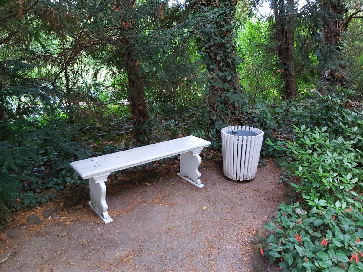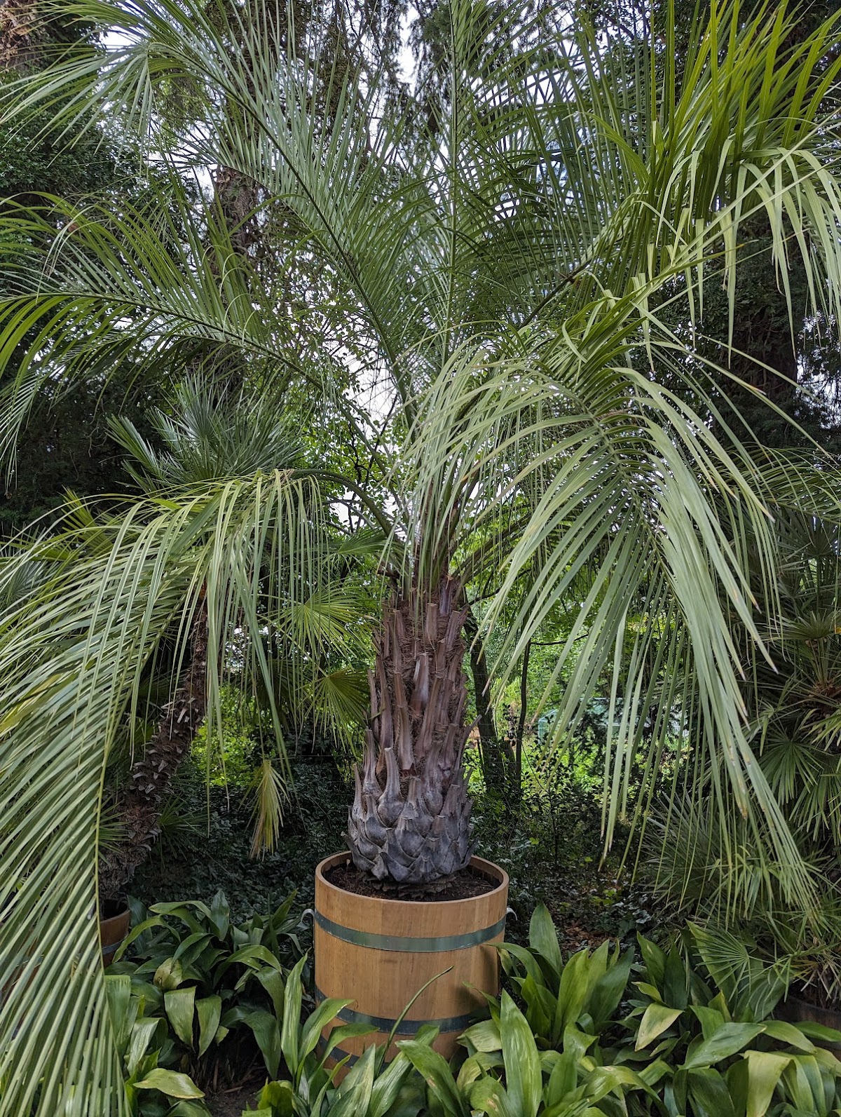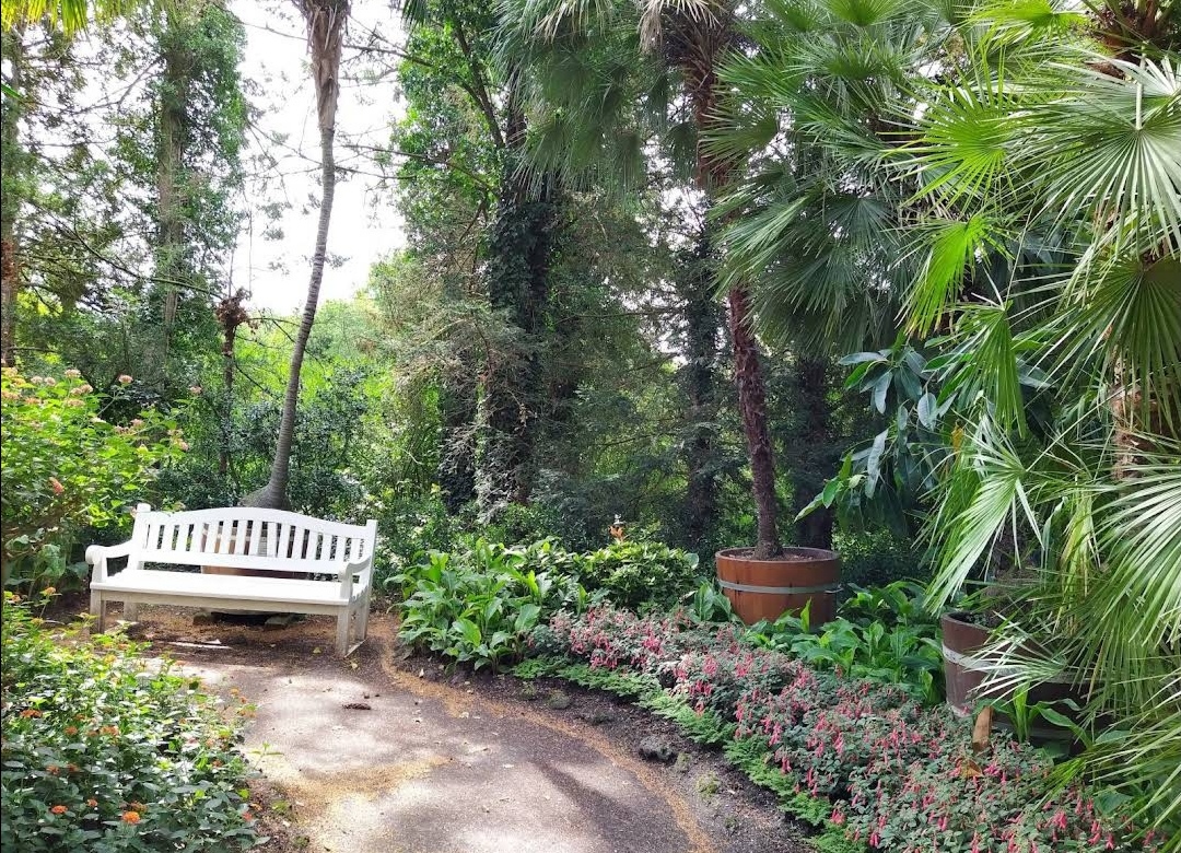 Schöner Palmengarten, in dem Bänke zur Erholung einladen. Vogelgesang abseits des Alltagstrubels in angenehmer Frische.