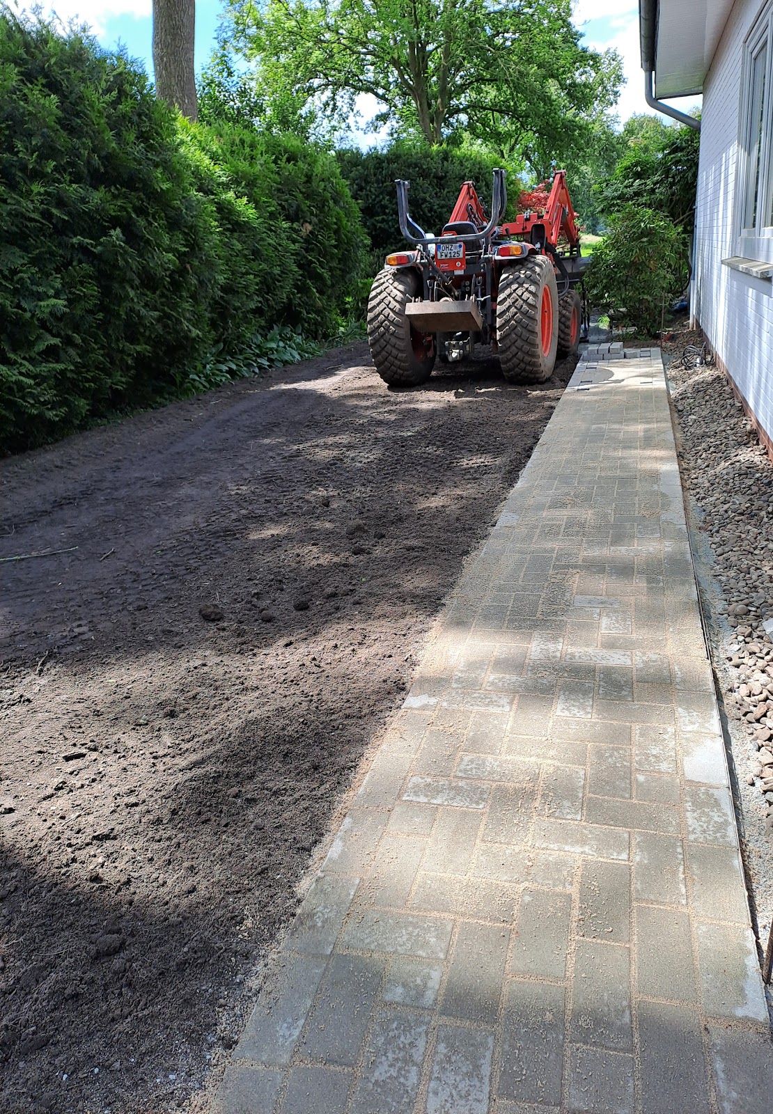 Wir haben ca. 350 qm Rasenfläche neu anlegen und ca. 110 qm Einfahrt (inkl. Entwässerungsrinne) und Wege pflastern lassen. Eingegange Buchsbäume hat Fabian auch gleich mit entfernt. Wir waren mit der Planung, dem Angebot und der Ausführung der Arbeiten voll zufrieden. Wir würden Fabian jederzeit wieder beauftragen und können ihn auf jeden Fall weiterempfehlen. Er war sehr freundlich und zuverlässig, sowie absolut geschickt und umsichtig bei der Arbeit mit seinen Maschinen.