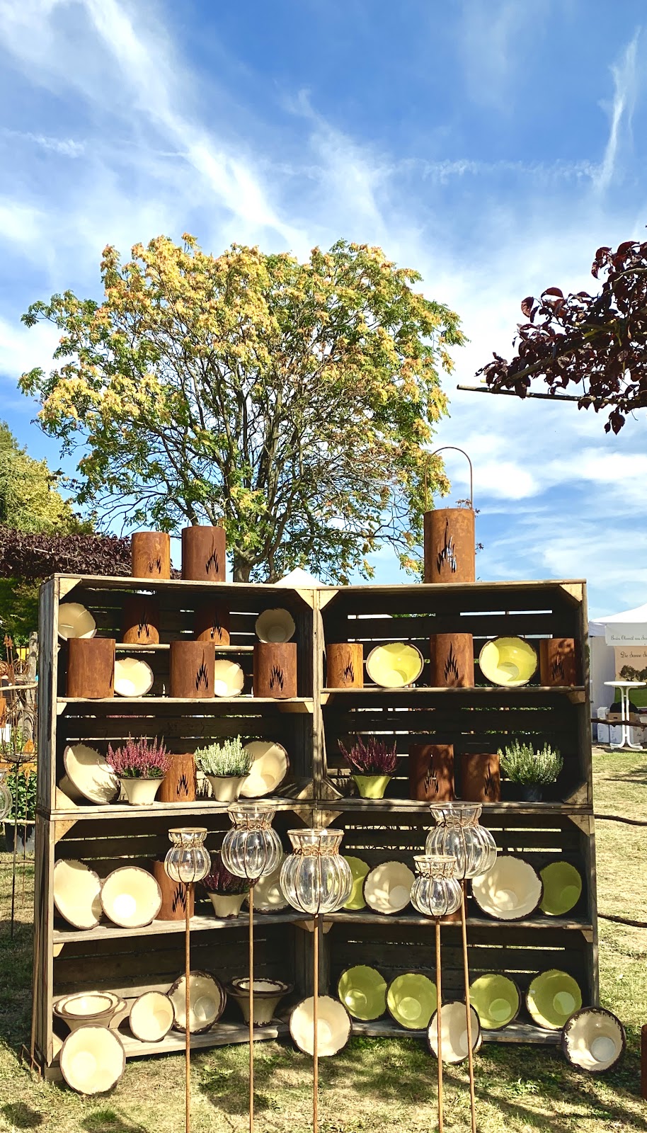 Apfel und Gartenfest bei Rosenhof Becker in Stommeln. Schöner Rahmen für einen vorherbstlichen Gartenmarkt. Neben den Dekortikeln gibt es ein gutes gastronomisches Angebot und reichliche Sitzgelegenheiten, was diesen Markt von anderen abhebt. Schöne Atmosphäre.
