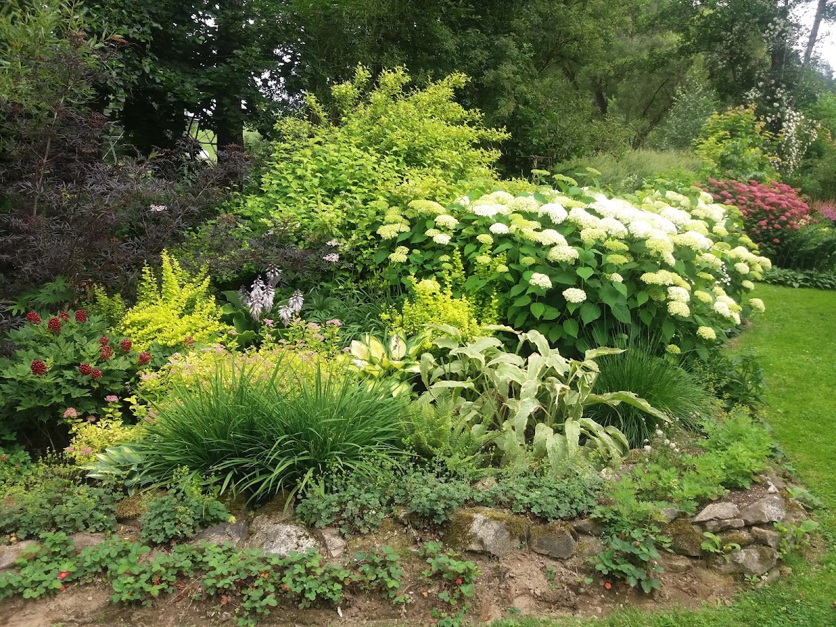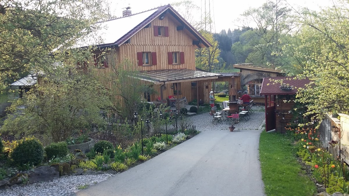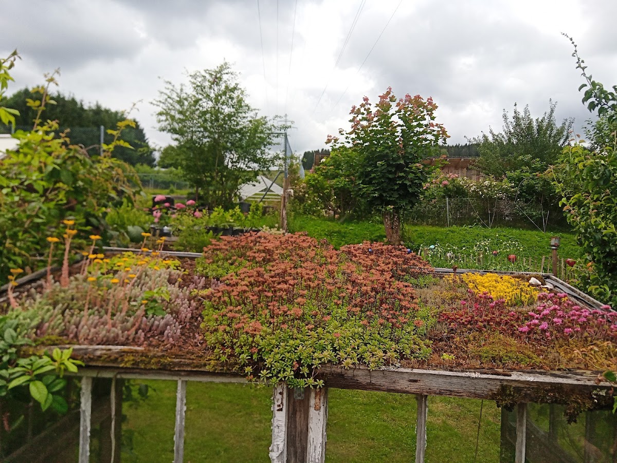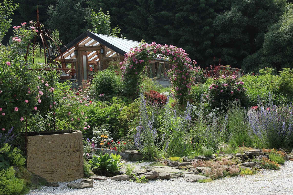 Wunderschön angelegter privater Garten. Im angeschlossenen Verkauf kann man Pflanzen, Gartenwerkzeug und zum Teil selbst geschweißte Garten-Deko, wie z. B. Rosenbögen, erwerben.