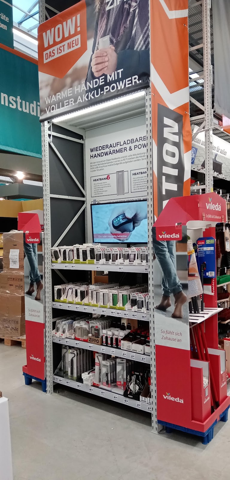 Leider hat man uns an der Information falsch geschickt. In den ersten Stock , einmal quer durch den ganzen Laden, obwohl die Ware (Vileda 2in 1 Wischer)direkt schräg gegenüber der Information ist. Oben war Erst nach 5 Minuten ein Verkäufer zu sehen 👀. Selbst der schickte und falsch. Erst der 2 Verkäufer wusste das die am Eingang aufgebaut sind. Das läuft bei Hornbach eindeutig besser.