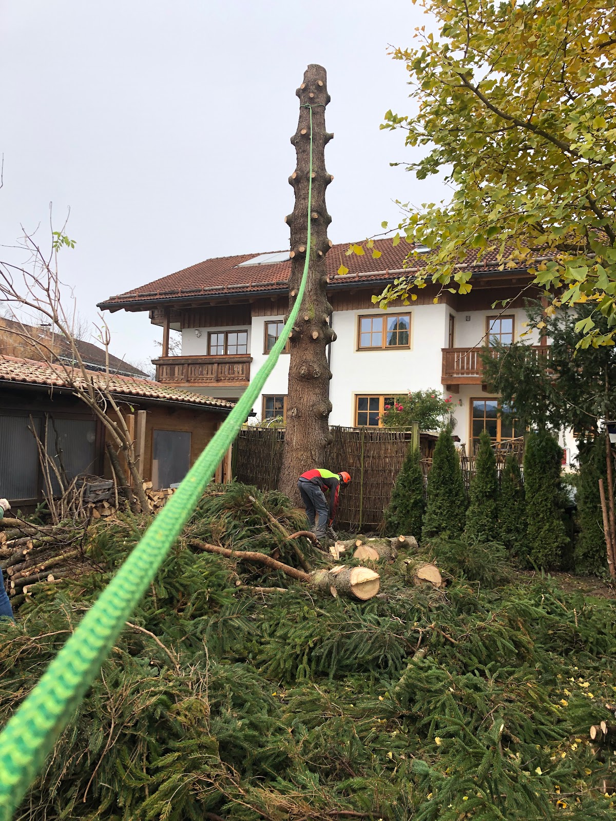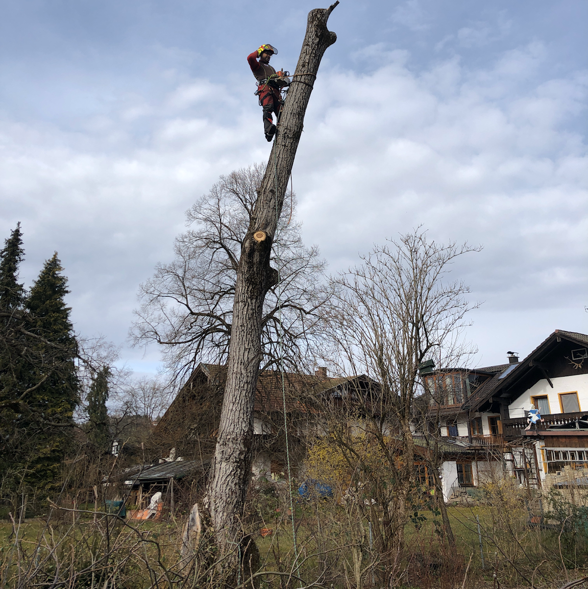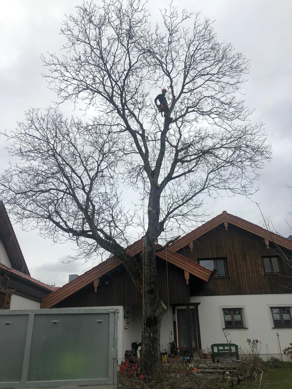 Die erbrachte Leistung war bemerkenswert. Trotz meines Erachtens schwieriger und enger Lage der zu entfernenden Bäume arbeitete das Team zügig, souverän und absolut zu unserer Zufriedenheit. Aufgrund der stark begrenzten Fläche mussten die nicht mehr standsicheren Bäume von oben abgetragen und abgeseilt werden, was mit Gelassenheit in kürzester Zeit erledigt wurde.