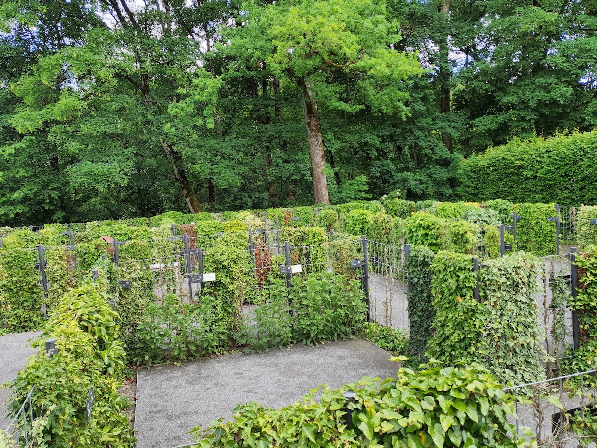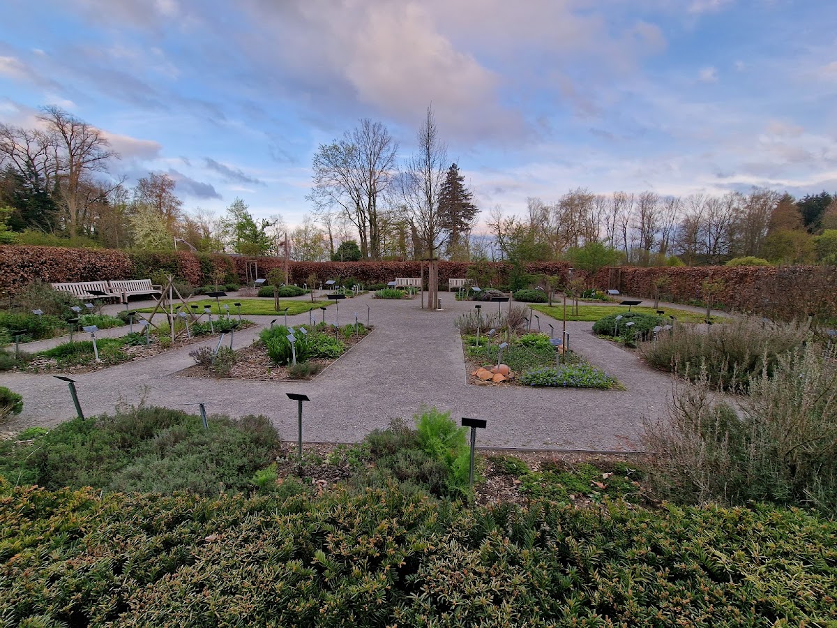 Ein entspannender Garten, bestehend aus einem Labyrinth, dem Hauptgarten und einem Teil mit Kräutern. Es gibt Bänke, wo man sich ausruhen kann.