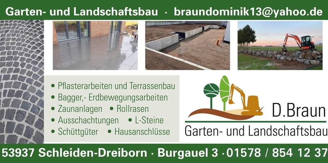 Erstklassiger Galabauer!!!!! Zwei Tage nach der ersten Kontaktaufnahme hatten wir bereits einen ersten Ortstermin, weitere zwei Tage war ein Angebot fertig. Wir haben uns, obwohl wir die Firma nicht kannten, auf das „Abenteuer“ eingelassen und haben sehr schnell festgestellt, dass diese Entscheidung genau die richtige war. Zwischen Beginn und Fertigstellung lagen gerade mal vier Wochen, in denen in der Regel zu zweit immens gearbeitet wurde. Dabei hatte man das Gefühl, dass quasi keine Pausen eingelegt wurden. Man hat gemerkt, dass Dominik und Lukas morgens mit Freude zur Arbeit gekommen sind und abends mit Vorfreude auf den nächsten Tag nach Hause gefahren sind. Die beiden haben nicht nur Kundenwünsche umgesetzt sondern in einem sehr angenehmen Rahmen auch eigene Ideen eingebracht. Das Ergebnis kann man an den Bildern sehen. Wir sind jetzt froh, dass unsere Baustelle ein Ende gefunden hat - aber müssten wir noch einmal einen Galabauer beauftragen dann definitiv nur die Firma D. Braun. Mit 1000 Superlativen, vielen Dank für die super Arbeit👍