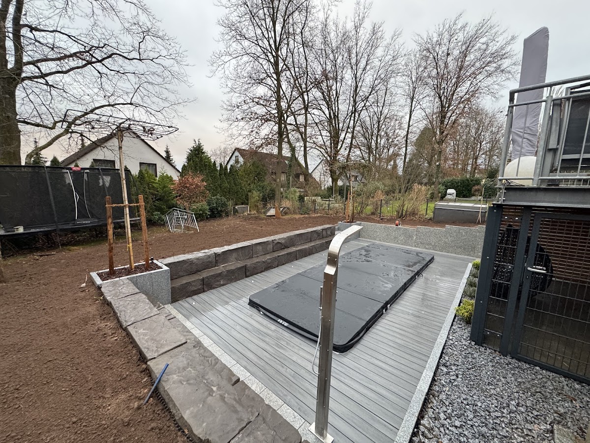 Bei der ersten Besichtigung unseres Gartens Mitte letzten Jahres war schnell klar, dass unsere Vorstellungen für Pool, Terrasse und Sauna nicht ganz einfach in der Umsetzung werden wird. Visar war aber gleich begeistert von dem Projekt und wir merkten schnell, dass wir die richtige Firma bei uns hatten. Die Umsetzung konnte sogar noch für 2024 mit eingeplant werden. Anfang November ging es mit Volldampf los. Über 300 Tonnen Erde und Lehm mussten erstmal raus - unser schöner Garten.... Das Wetter spielte leider nicht mit und es regnete eine Woche immer wieder - aber Visar und sein Team waren nicht aufzuhalten. Bald sah man wie es zukünftig werden wird. Die Terrasse wurde halbseitig um ca 80cm abgesenkt der Poolbereich gemauert alles mit Granitpalisaden eingefasst, Fliesen und WPC verlegt, Bäume eingepflanzt. Der Pool gesetzt und die Sauna eingebracht. Dann kam der Winter und der Abschluß musste auf 2025 verlegt werden. Und jetzt ist alles fertig. Neue Bewässerungsanlage neuer Terrassenbelag, Rollrasen und Beet-Einfassungen und zum Schluß noch die Einfahrt gepflastert. Wir können nur sagen die Mühen haben sich gelohnt - es sieht einfach nur WOW aus. Vielen Dank an Visar und sein Team. Bei euch waren wir in den richtigen Händen!!!