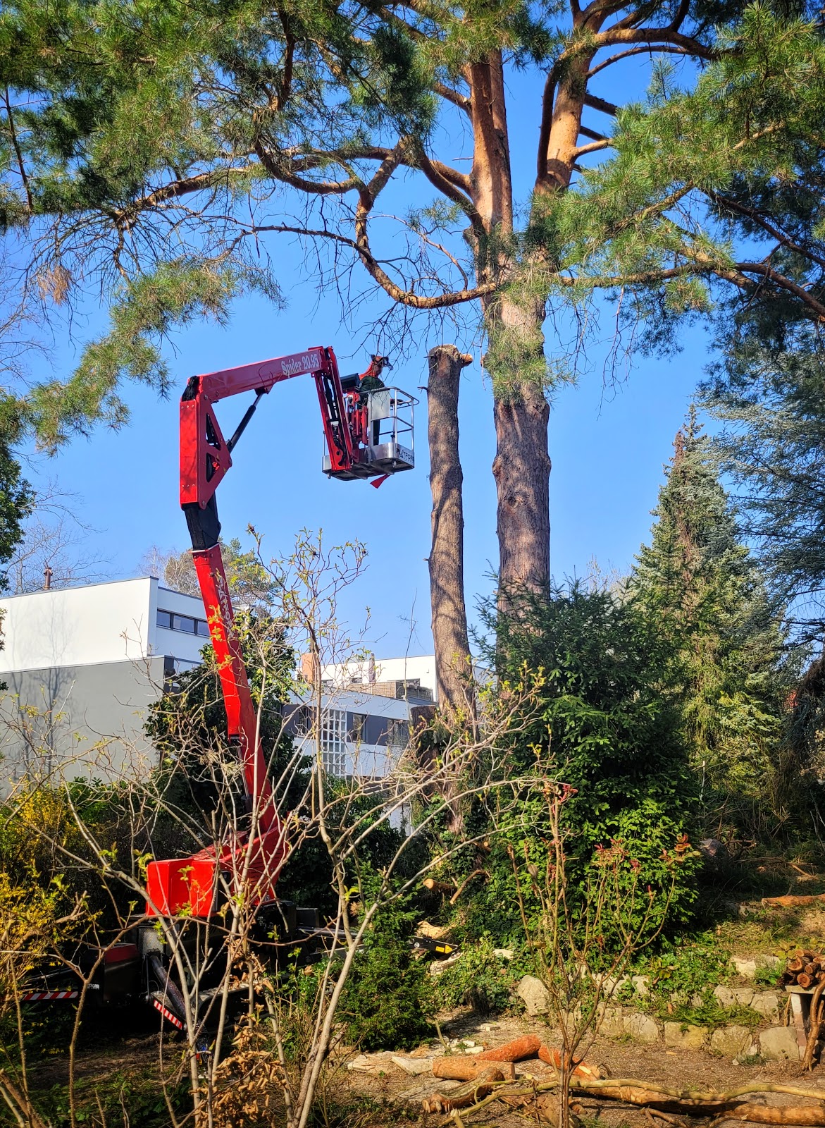 SUPER Arbeit und seeeehr empfehlenswert. Abgesehen vom guten Preis, Punktlichkeit und sypathischem Auftreten von Hr. Müller, besitzt er eine sehr faszinierende Hebebühne als Arbeitsgerät, die definitiv in diesem Bereich ein Alleinstellungsmerkmal ist. Einerseits lässt sie sich so schmal machen dass sie durch die schmalsten Gartentore etc. passt, fährt dann aber auf über 20 Meter in der Höhe aus und schlägt somit jeden Baumkletterer um Längen, da Hr. Müller den Baum Stück für Stück absägen kann, die Baumscheiben dann in seine Gondel lädt und sanft nach unten fährt. Gerade in unserem Fall war das ein Riesenvorteil, da ein sehr großer Stamm weit auf das Grundstück der ( etwas pingeligen) Nachbarn ragte, und Hr. Müller mit der Gondel dort einfach rüberfuhr und nix herunterfallen lassen musste. Wären dort große Äste etc. Auf deren Garten gefallen, hätte es sicherlich mächtig Ärger gegeben. Insofern : Alles perfekt!! Von mir klare 6 STERNE!!