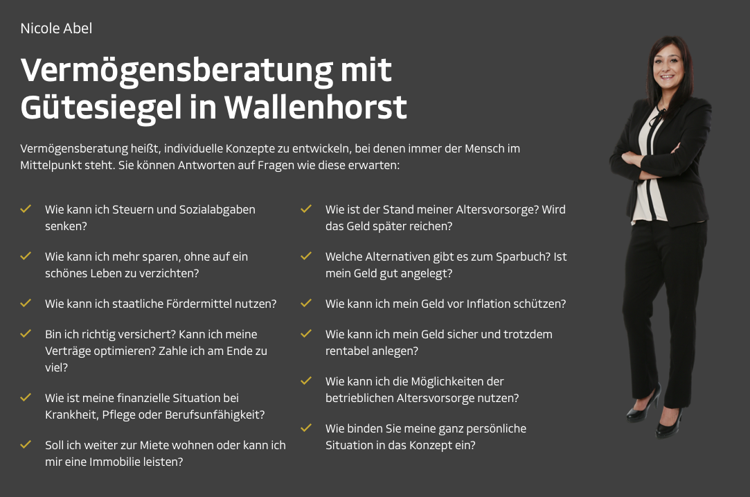 Ich selbst darf die Erfahrung mit Nicole machen und bin super zufrieden, man fühlt sich ernst genommen, total wohl und sie geht auf deine Wünsche ein. Mit Nicole an der Seite, bin ich viel gelassener geworden, was meine Finanzen angeht. Lieben dank, Nicole