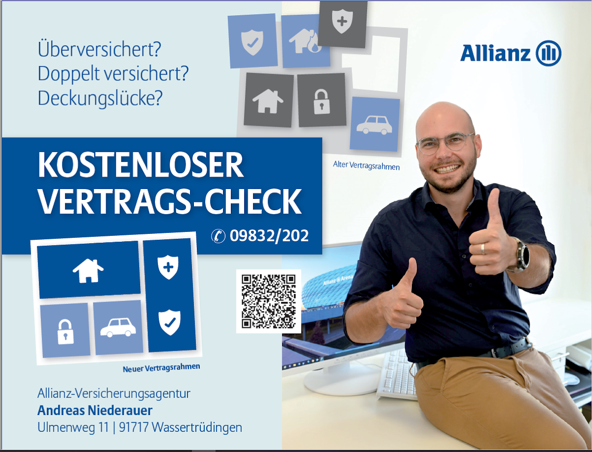 Sehr zu empfehlen! Herr Niederauer ist auch in komplizierten Vertragsangelegenheiten ein überaus kompetenter, und sehr freundlicher Ansprechpartner. Anfragen und Problemlösungen wurden in meinem Fall in Lichtgeschwindigkeit bearbeitet. Sehr gerne werde ich auch in Zukunft mit meinen Versicherungsanliegen bei der Allianz Versicherungsagentur Andreas Niederauer vorsprechen, da mir hier bisher am Besten und Schnellsten geholfen wurde. Vielen Dank Herr Niederauer! Bis bald!