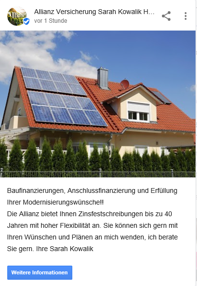 Sarah Kowalik berät uns allumfassend. Sie fragt unseren Versicherungsbedarf genau ab und bietet uns bedarfsgerechte Lösungen an. Wir können diese Agentur nur weiterempfehlen, Schadenbearbeitung erfolgte kurzfristig und zu unserer Zufriedenheit.