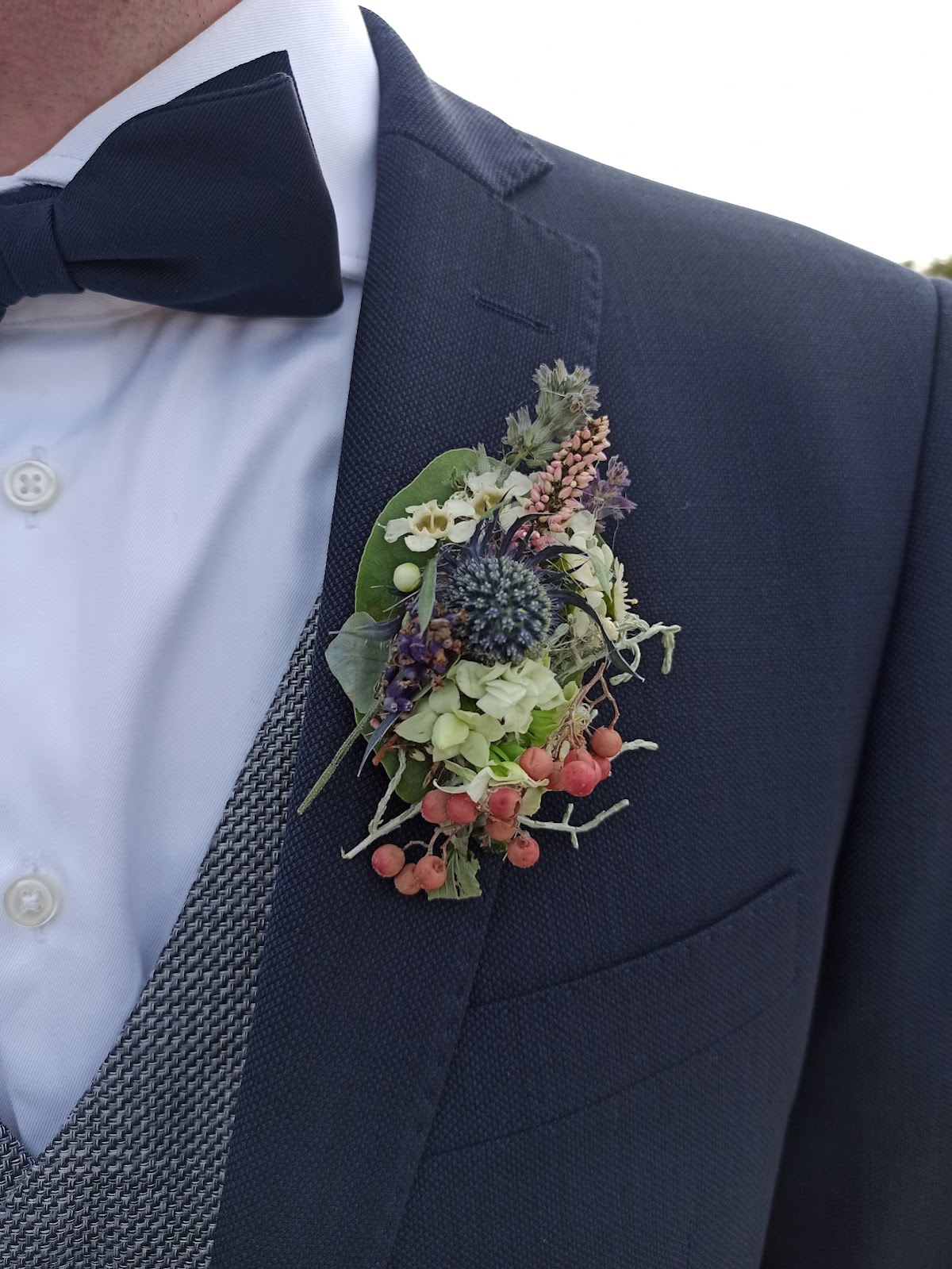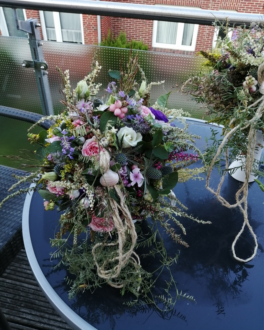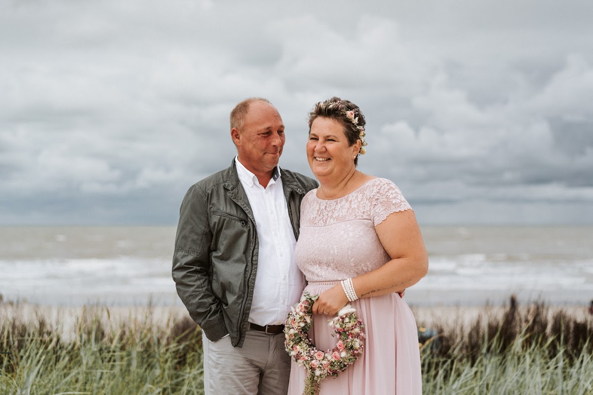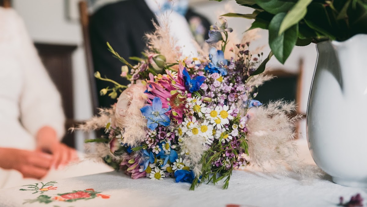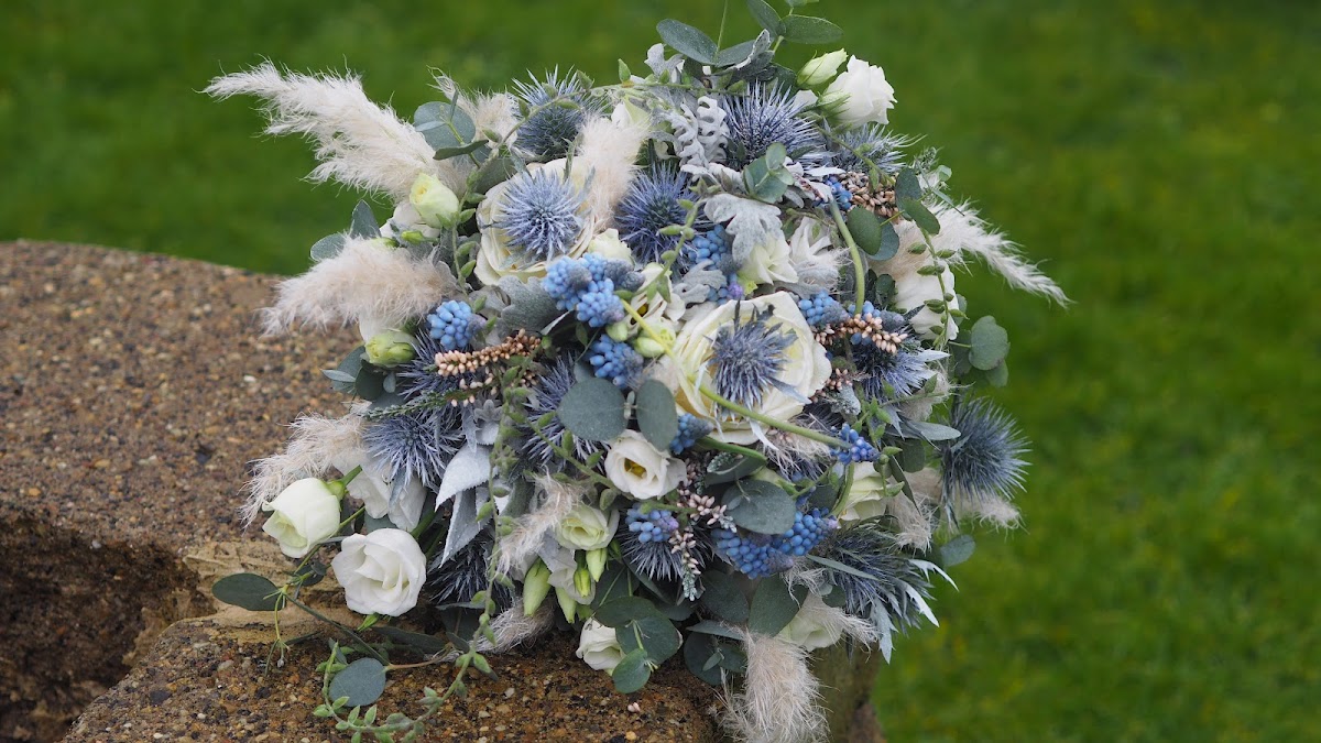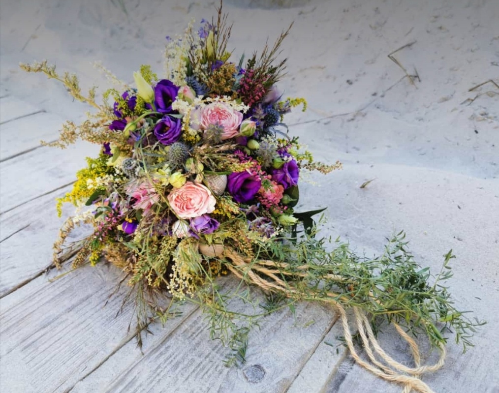 Der bestellte Brautstrauß "Im Ostfriesenlook" bescherte der Braut am Hochzeitsmorgen die erste Freudentränen - so wunderschön gebunden. Blaue Hortensien umarmt von weißem Wattflieder und weiteren weißen zarten und blauen Blüten, gehalten von kunstvoll gelegten Dünengräsern, die in einem eleganten Schweif endeten. Die Krönung des Straußes bildeten die kleinen weißen Muscheln, die auf den Dünengräsern oberhalb angebracht waren. Das Sträußchen für den Bräutigam wurde entsprechend gefertigt und sah ebenso ganz wunderschön aus. Wir fühlten uns rundum sehr gut beraten und bedient. Die Freude an der kreativen Gestaltung war offensichtlich, welche zu einem unvergesslichen Erlebnis am Hochzeitsmorgen geworden ist.