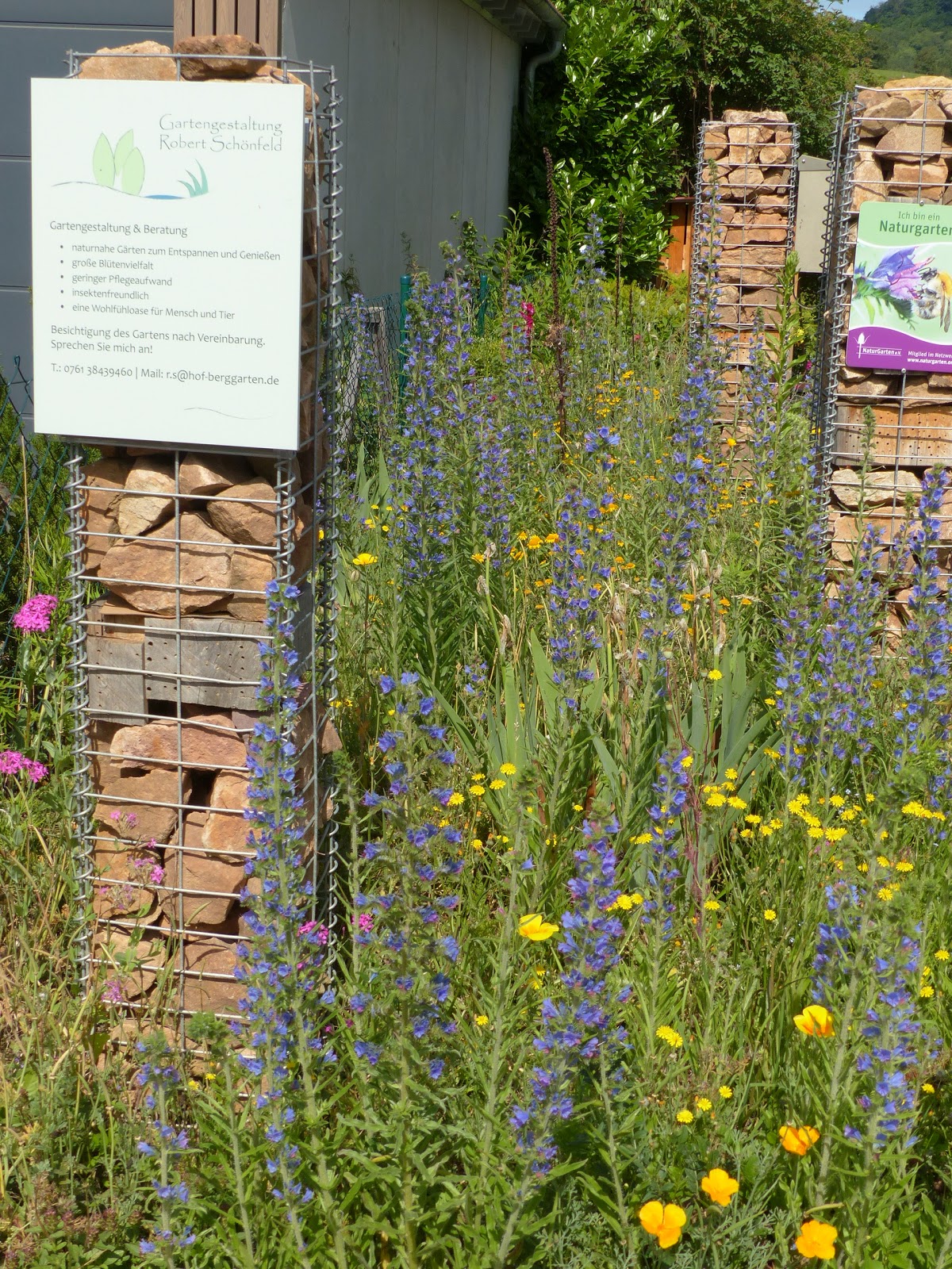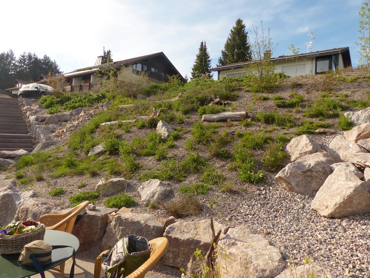 Als grosses Glück benennen wir es, dass wir Robert Schönfeld auf der Suche nach einem Naturgartengestalter bereits vor Baubeginn gefunden und kennen gelernt haben. So kannte er uns und das stark überwachsene, mit zum Teil sehr schönen Bäumen und Sträuchern bestückte 2000m2 Grundstück auf 1000müM, das durch den kurzfristig geplanten Neubau zum grossen Teil bedauerlicherweise abgerodet werden musste. Die Umgebungsarbeiten schritten voran, nachdem der Neubau zum grossen Teil fertig gestellt war und Robert Schönfeld konnte nun seine Pläne und Ideen vorstellen und im selben Herbst zum Teil auch schon pflanzen, damit der erste Frühling nicht mehr ganz so spärlich an grün und bunt war. Was wir dann jedoch im zweiten Frühling erlebt haben ist nur mit dem Wort "zauberhaft" zu beschreiben. Mit den ersten Sonnenstrahlen konnten wir tägliches Wachstum beobachten, das sich zu wunderschönen Blütenprachten entwickelte und uns den ganzen Sommer mit immer neuen Farben und Blüten bereichert und beglückt hat. Es summt und brummt und die Schmetterlinge tanzen in der Sonne. Auch Eidechsen und Grillen haben ein neues Zuhause entdeckt. Und auch jetzt im Herbst strahlen die Silberdisteln um die Wette, die Früchte der Wildrosen gedeihen in roter Vielfalt und die Insekten und Vögel finden noch immer Nahrung. Sämtliche von Robert Schönfeld besorgten Pflanzen und Samen zeugen von allerbester Qualität. Inzwischen hat Robert Schönfeld verschiedene Trockenmauern gebaut - grössere und kleinere, die bewachsen werden und kleinen Nützlingen einen Unterschlupf bieten. Auch ein Naturgarten muss Hege und Pflege erfahren und so wird uns Robert Schönfeld weiterhin mit Rat und Tat zu Seite stehen. Es war ein grosses Projekt und eine grosse Herausforderung für Alle. Mit guten Ideen und Feingefühl hat Robert Schönfeld zur Entstehung einer Naturoase, die der Biodiversität sehr gut Rechnung trägt, beigetragen. Dafür danken wir Dir sehr, lieber Robert
